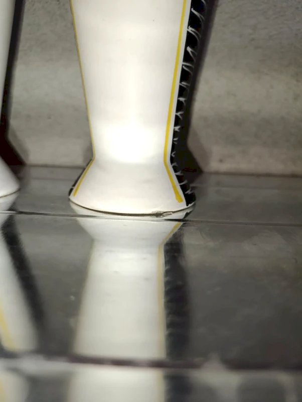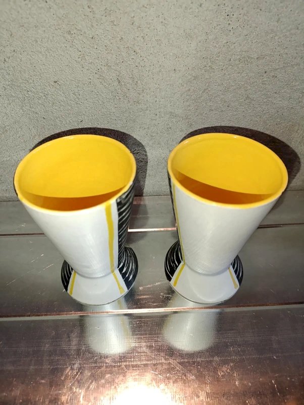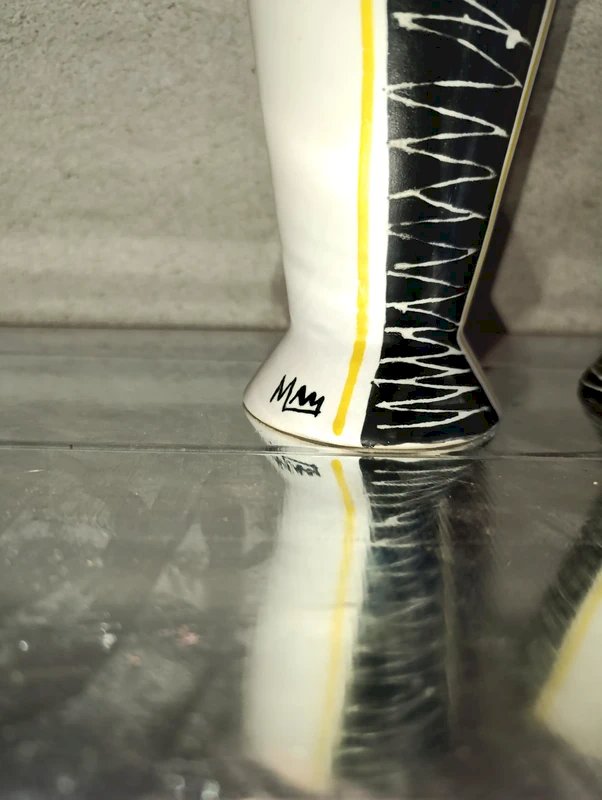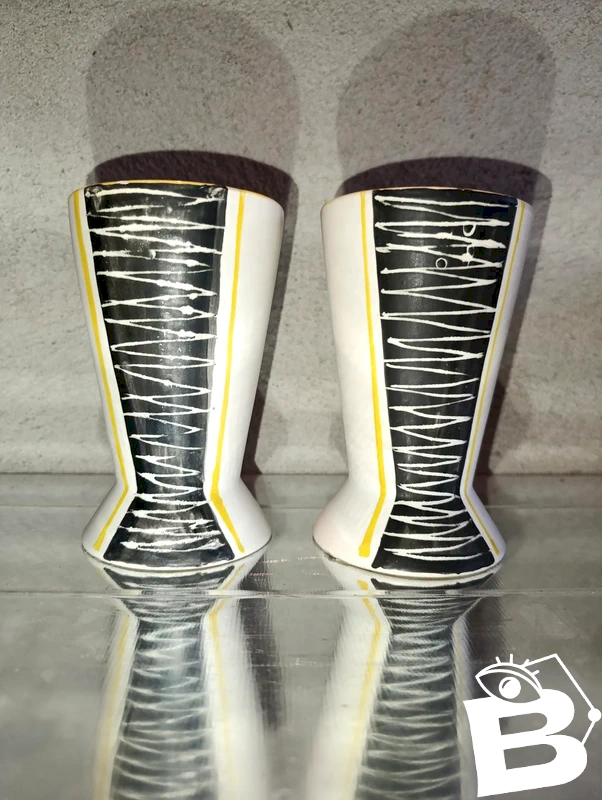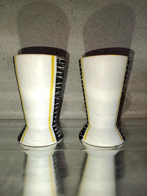 set of 2 vintage signed Vallauris cone mazagrans vases in good condition, height 13.5cm, note one or two small chips and a small chip under the foot of one, see photo.