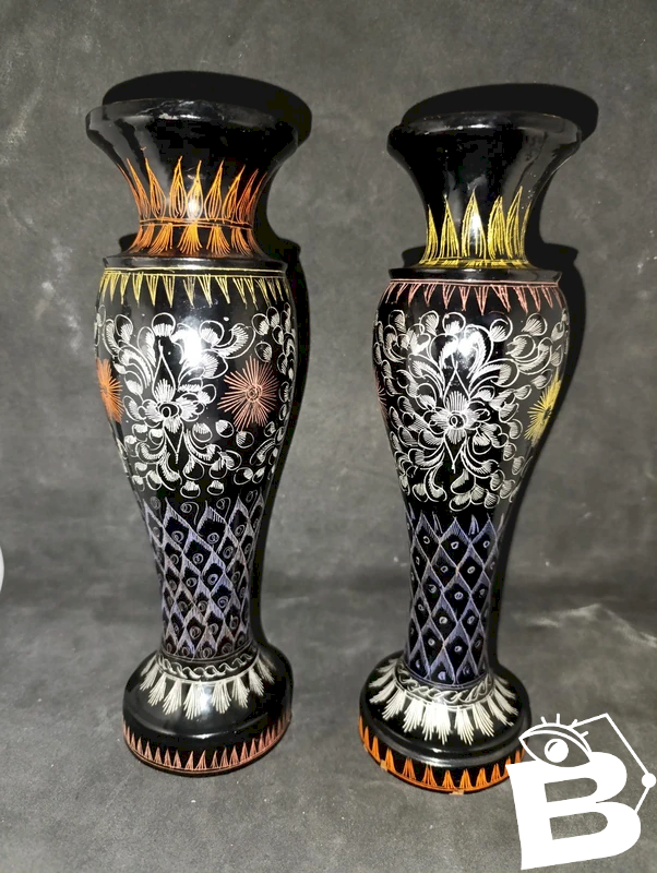 set of 2 wooden vases with floral decorations in good condition