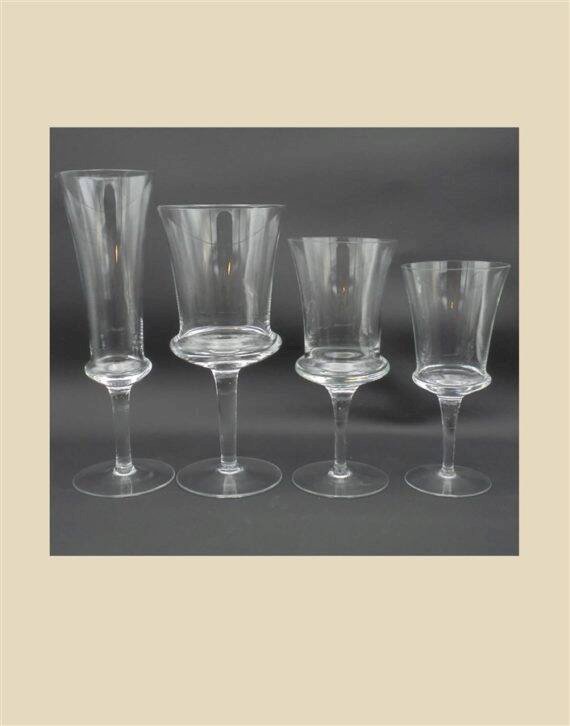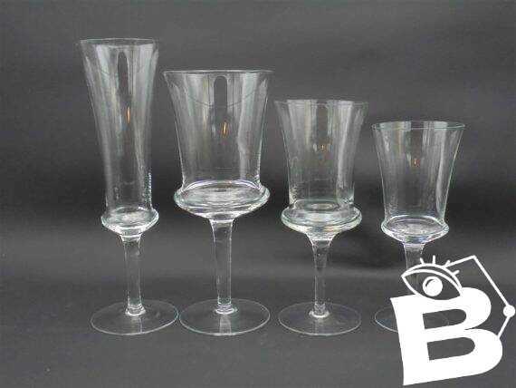 Footed glass service consisting of 6 wine glasses, 6 water glasses, 6 liqueur glasses, and 6 champagne flutes. They are made of glass and are in good condition. Dimensions in the photo. Weight: approximately 2.5 kg. L: 7 cm W: 7 cm H: 17 cm.