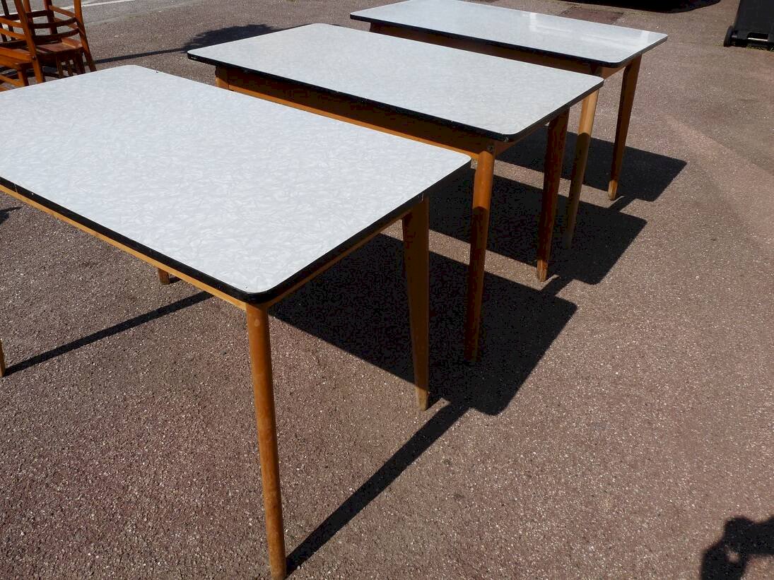 set of 3 tables in vintage white formica and wood