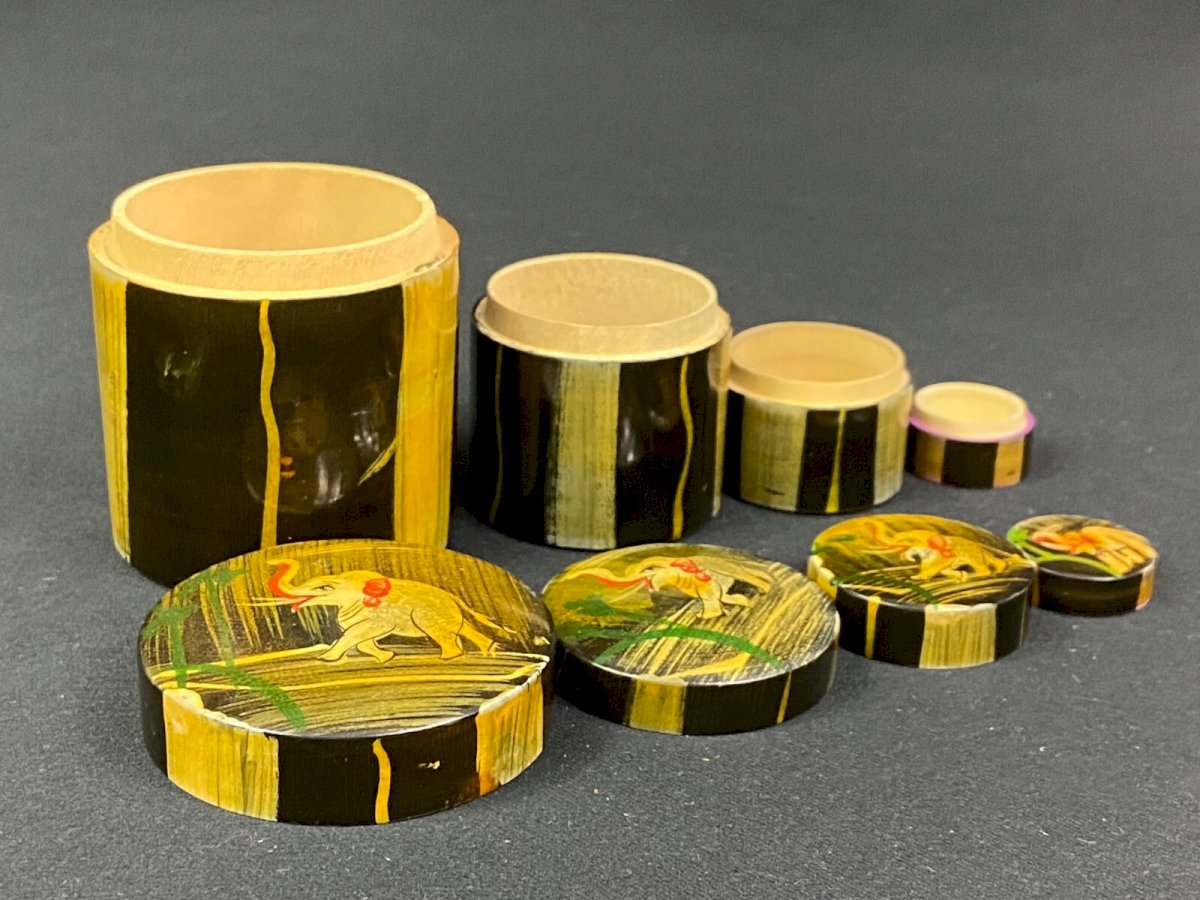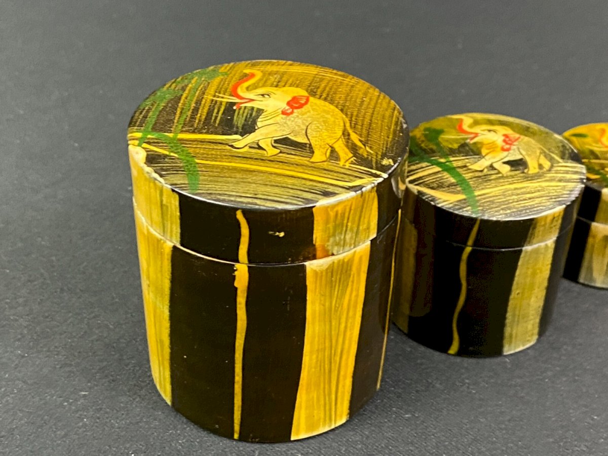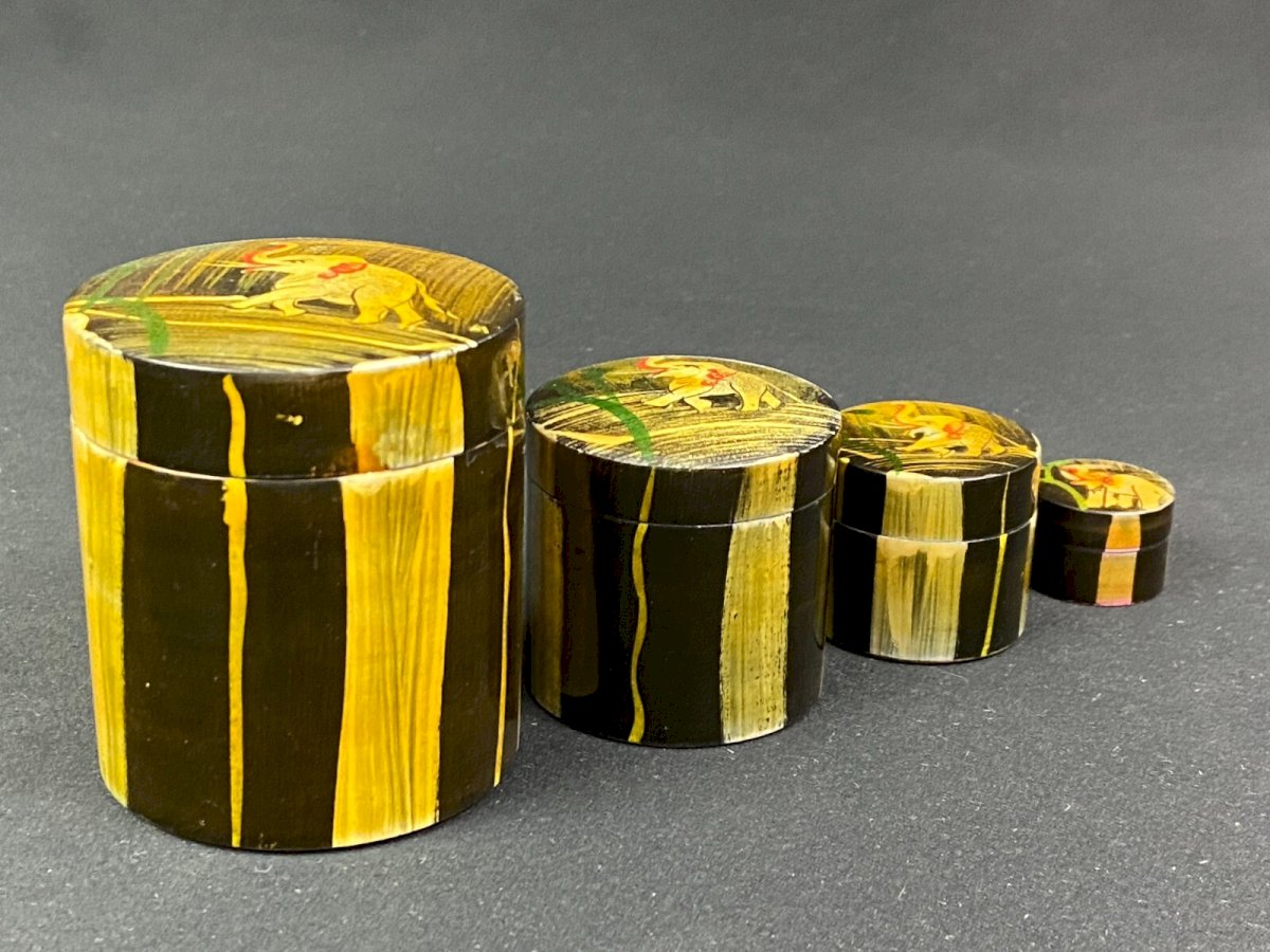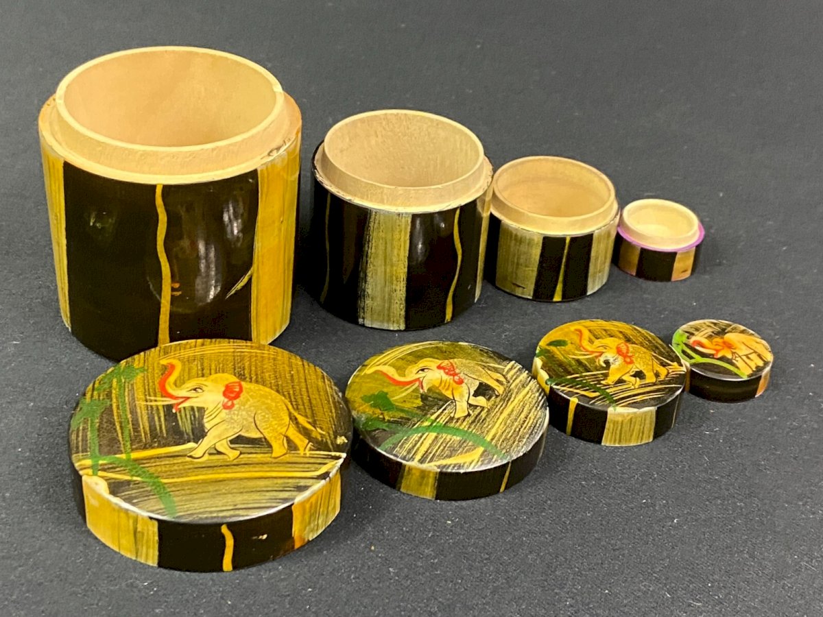 Set of 4 nesting boxes made of painted wood decorated with elephants. Very good condition. Maximum dimensions: Height 6.8 x 5.9 / Height 4.7 x 4.7 / Height 3.2 x 3.6 / Height 1.8 x 2.5 cm. Total weight: 87 grams. Ultra secure shipping worldwide - Pickup of orders possible by appointment at 7 rue Notre-Dame 18000 Bourges. - Possibility of combining items in the same package: please contact me beforehand so I can calculate your optimized shipping costs. Authenticity: Original. Type: Box. Origin: Asia. Material: Wood. Country of origin: China.