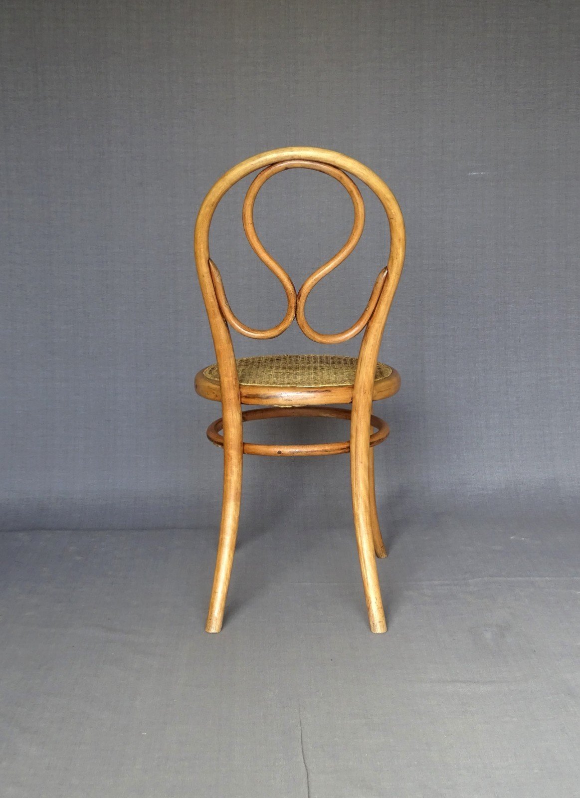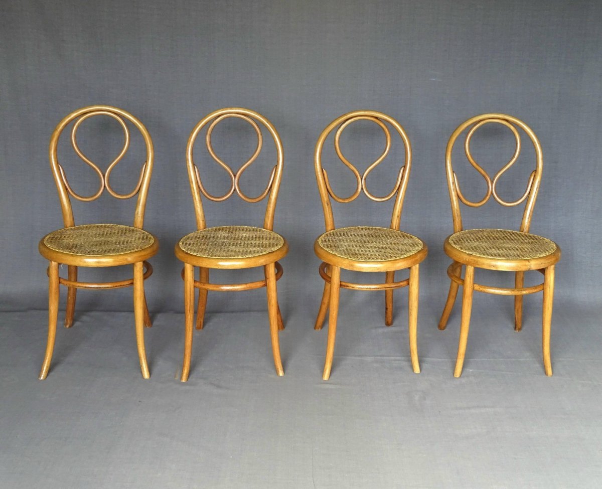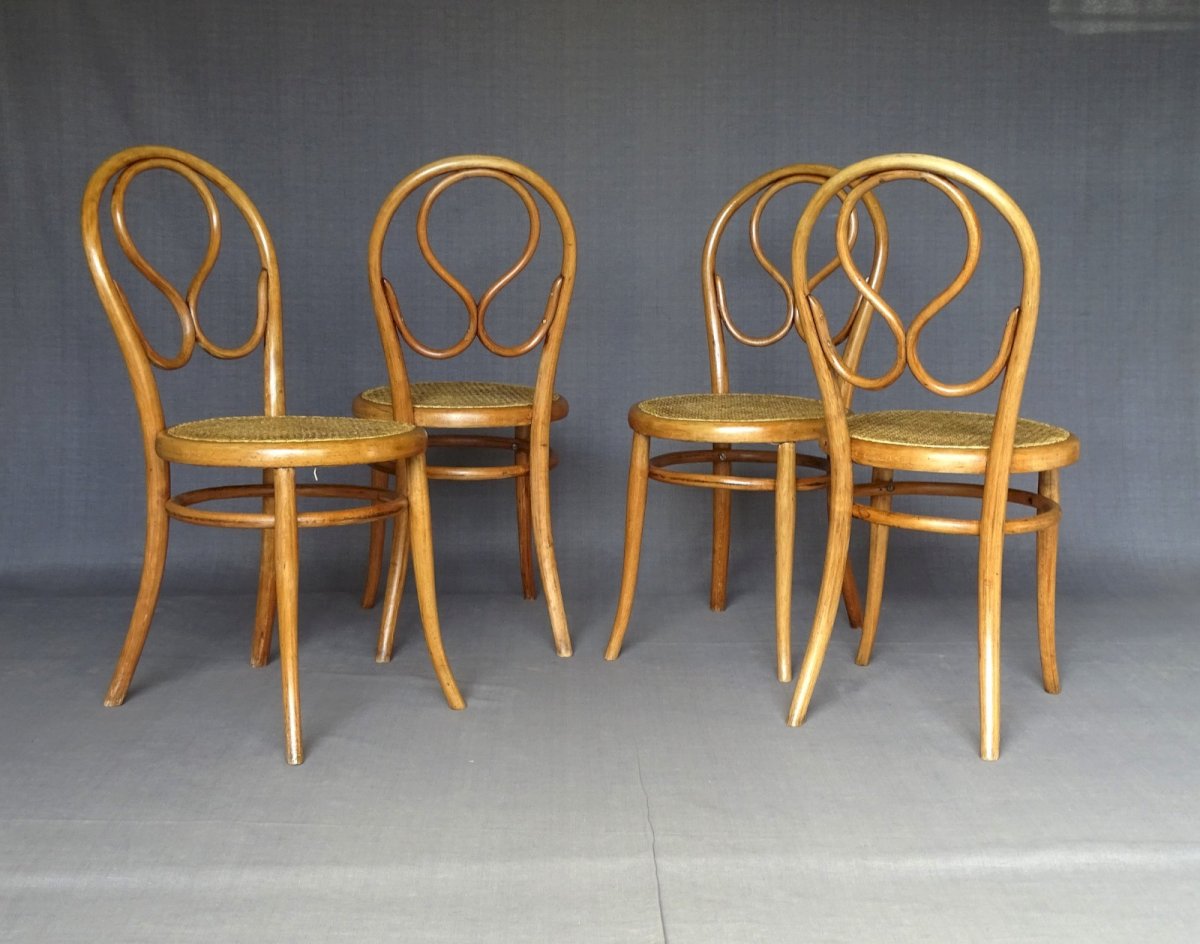 Set of 4 Thonet chairs No. 20 known as "omega" dating from 1875 - very good original condition - Curved rear legs very arched, typical of this production. Stamp, label 1b and label Boulevard Poissonnière. This seemingly uniform set consists of two slightly different constructions, two have through legs and the others have short tenons. All 4 have the closure of the side rail. They are originally "Natural beech" - The caning is in good condition, apparently recent. Seat height: 47cm - seat diameter: 42 cm - overall height: 91 cm More photos and information available upon request Parcel shipping to France, Europe or pickup in Alsace. Color: natural Number of pieces: 4 Type: Chair Brand: Thonet Period: XIX century and earlier Subtype: Bistro Country of origin: Austria Material: Beech Style: Art Nouveau