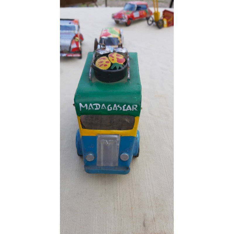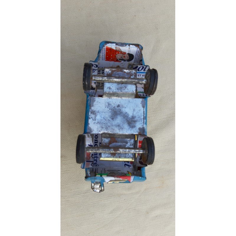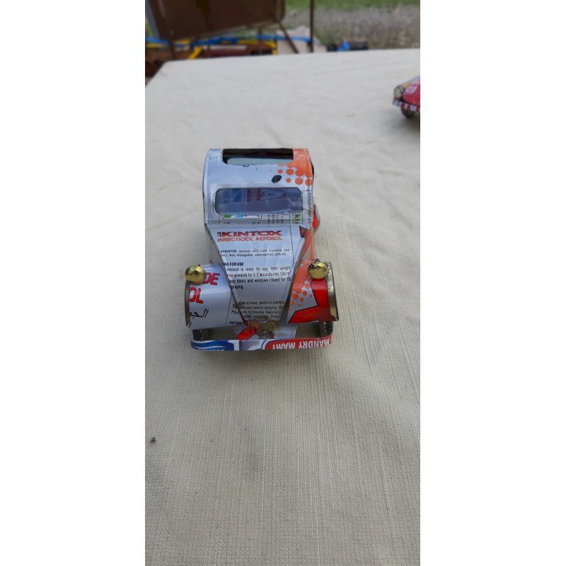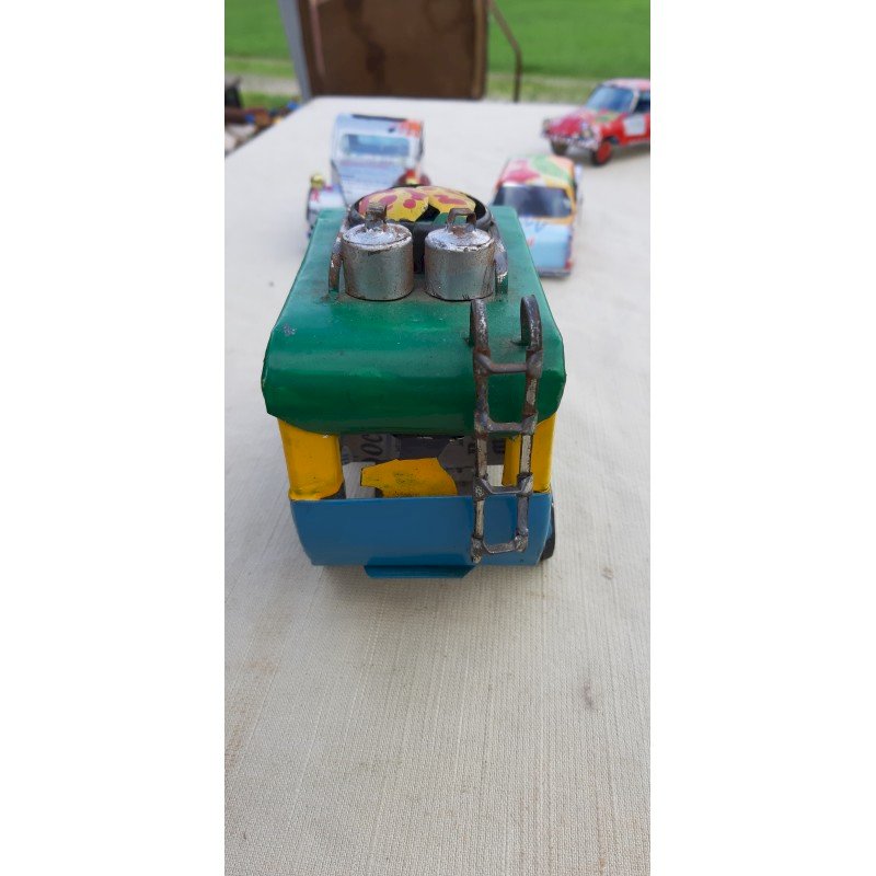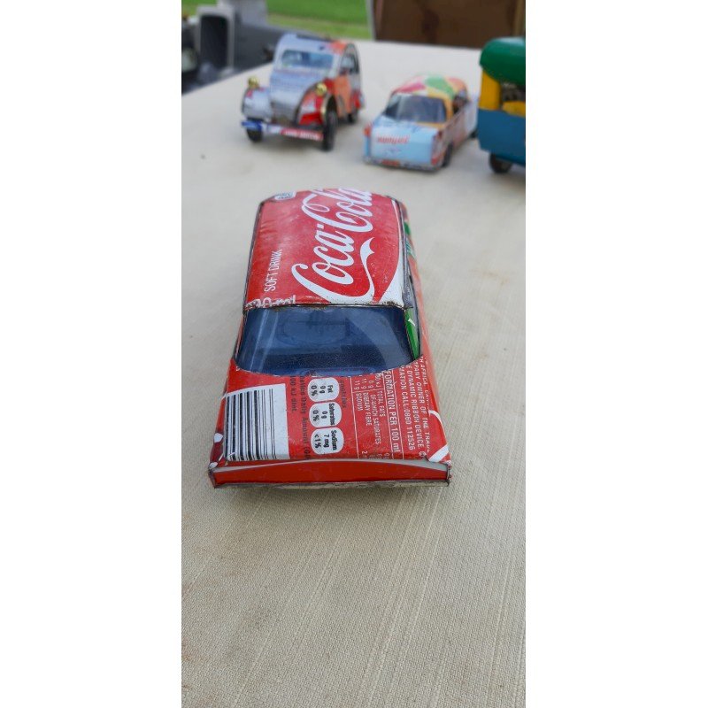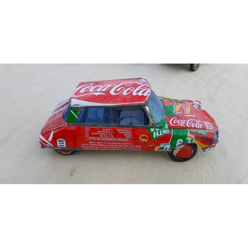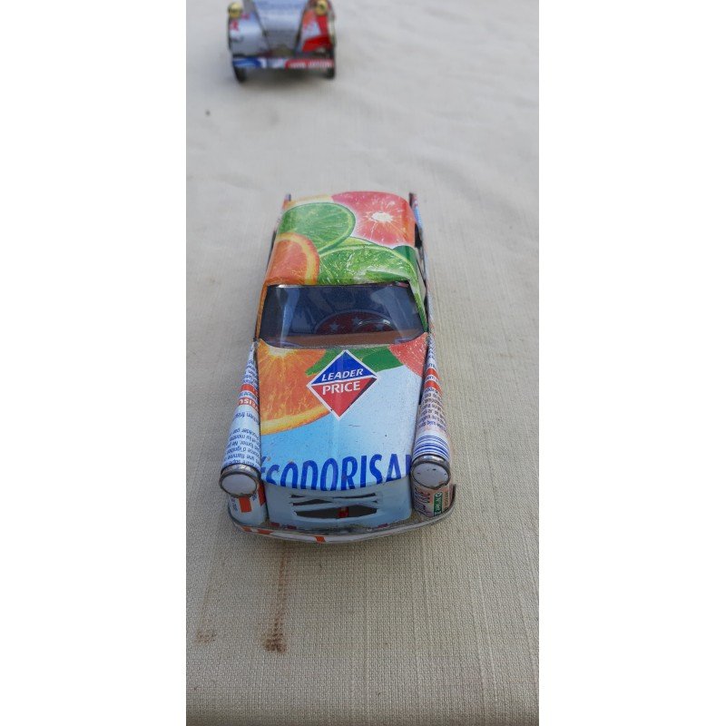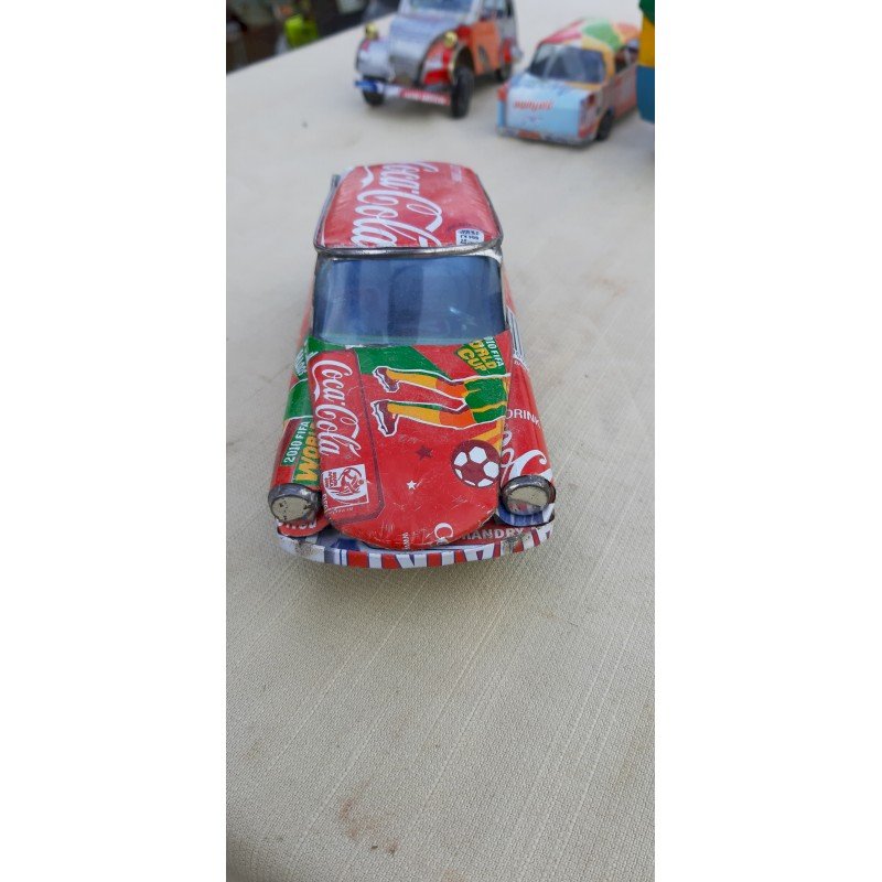 Set of 5 African Cars, made from juice cans, Coca-Cola and others, Bush Taxi height: 12.5 cm, length and width: 18 cm by 8 cm, DS, 2 CV, Peugeot 403 and Tuktuk completely made with local materials by small Africans.
