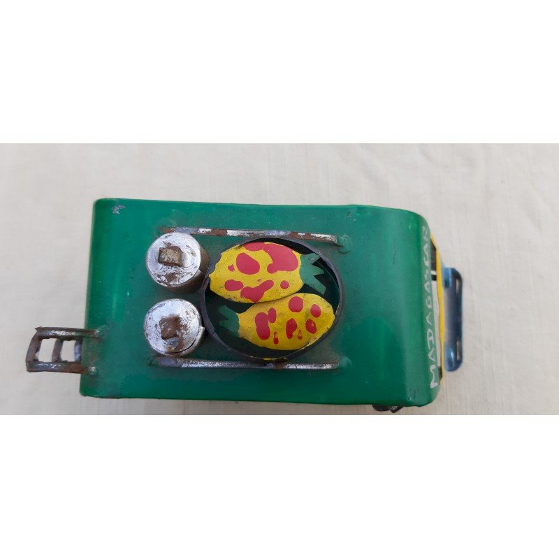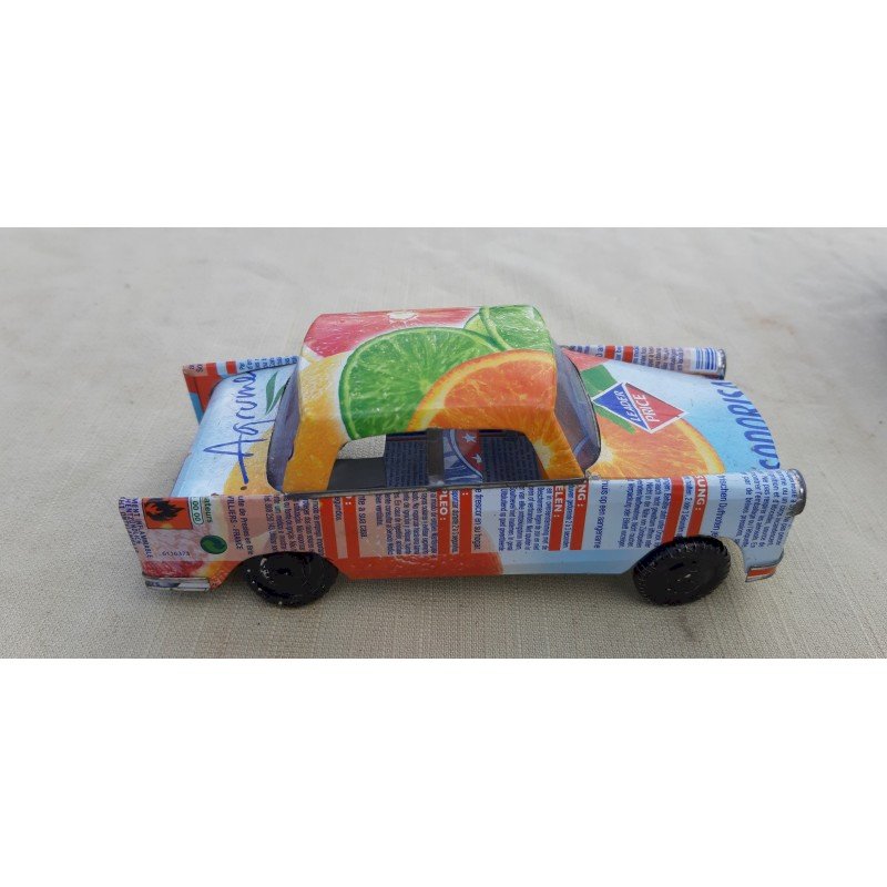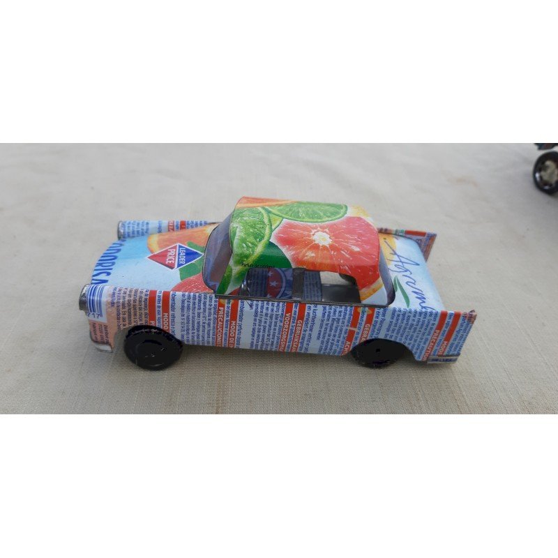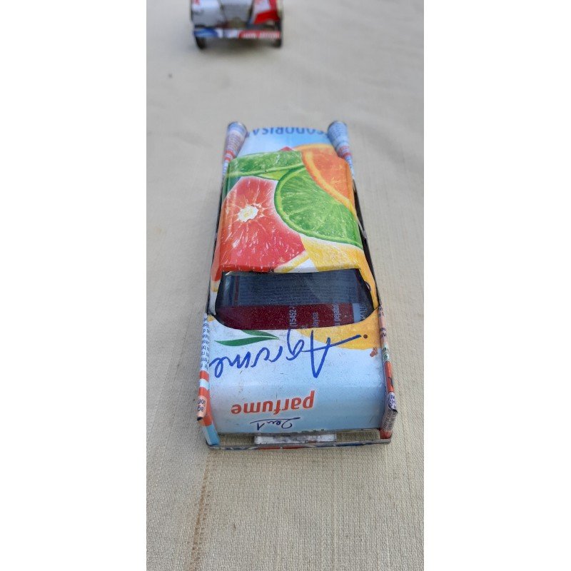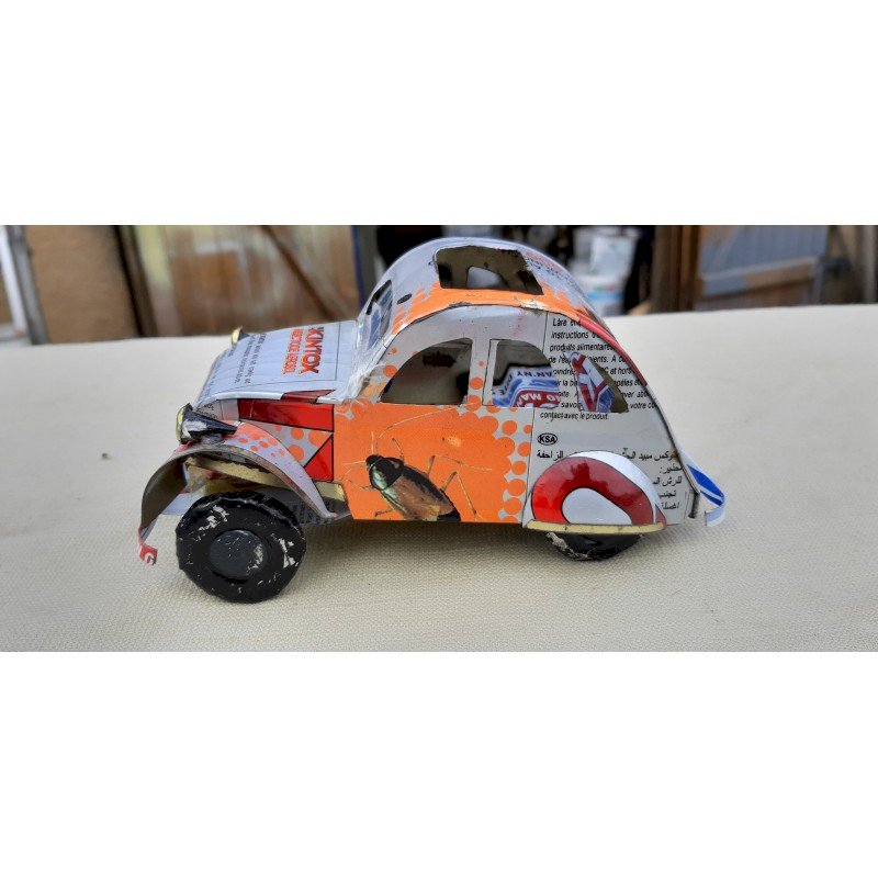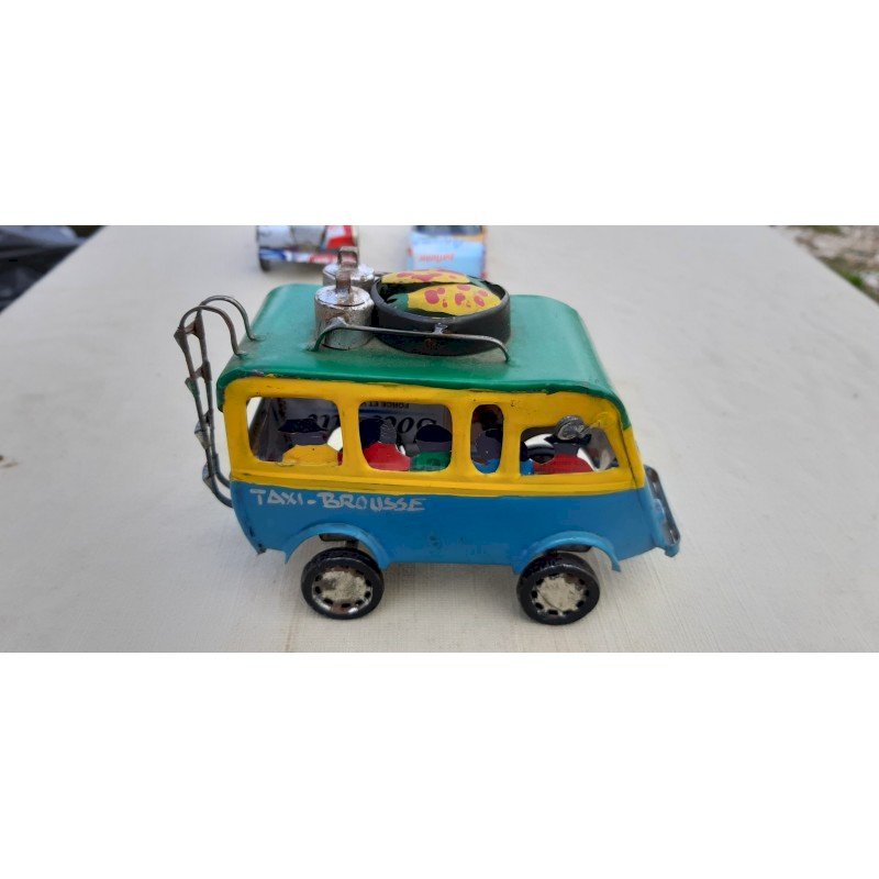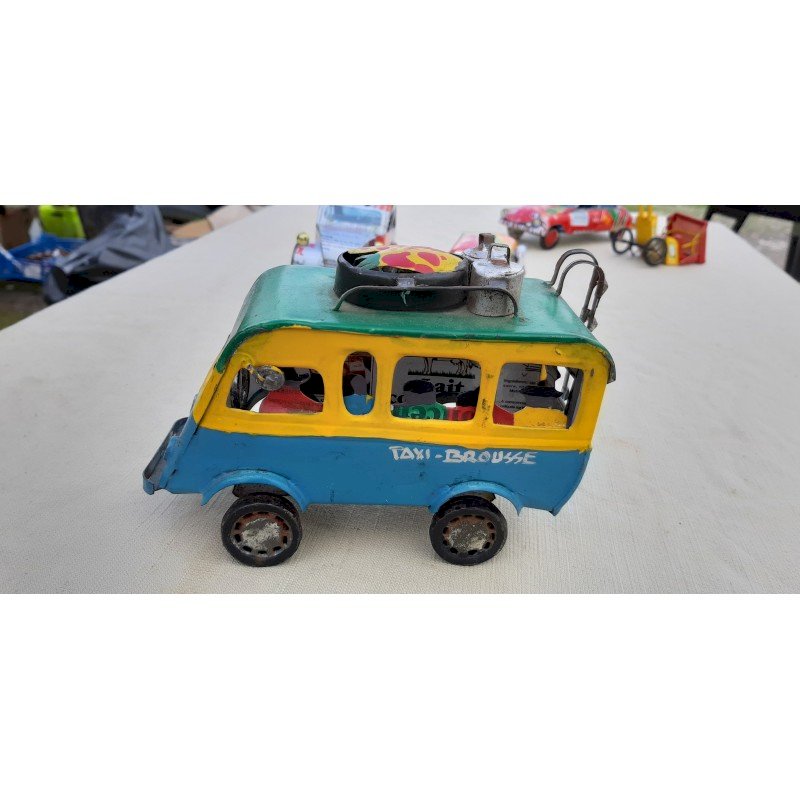 Set of 5 African Cars, made from juice cans, Coca-Cola and others, Bush Taxi height: 12.5 cm, length and width: 18 cm by 8 cm, DS, 2 CV, Peugeot 403 and Tuktuk completely made with local materials by small Africans.