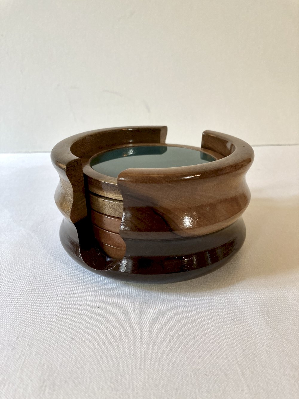A small intrinsic imperfection in the wood of one coaster; otherwise, the set is in perfect condition, with no defects to report.