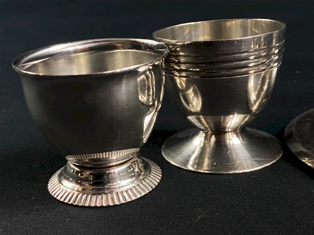 Set of 5 silver-plated egg cups Dimensions: - Height 4.4 x diameter 4.5 cm - Height 4.8 x diameter 4.5 cm - Height 4.3 x diameter 4.8 cm - Height 4.9 x diameter 4.6 cm (wear on plating) - Height 4.8 x diameter 9.2 cm (slight wear on the back of the stand) Weight: 211 grams Ultra-secure shipping worldwide - Order pickup available by appointment, 7 rue Notre-Dame 18000 Bourges. - Combined shipping possible in the same package: please contact me in advance so I can calculate your optimized shipping costs. Authenticity: Original Type: Tableware, Kitchen Origin: France Period: 20th Century Design Country of origin: France Subtype: Egg cup Material: Silver-plated metal