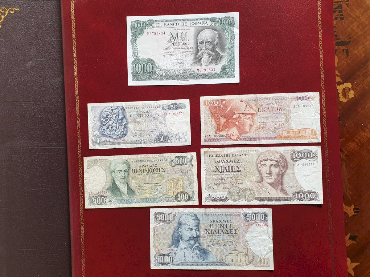 Greek banknotes: this is the complete series from the 80s. There are creases, mini tears on the edges except for the 100 drachmas which has visible tears of several millimeters as shown in the photos, and some dirt. The condition is still quite good.