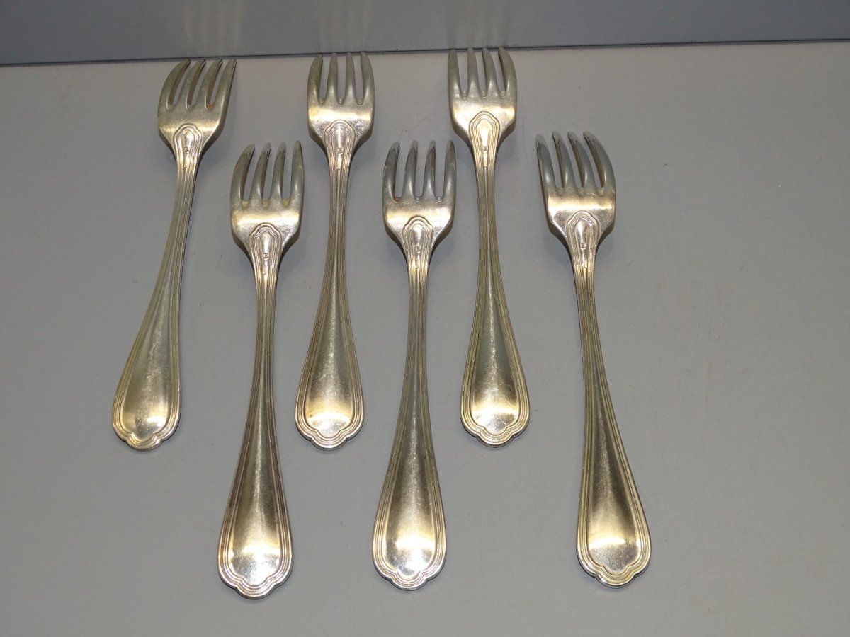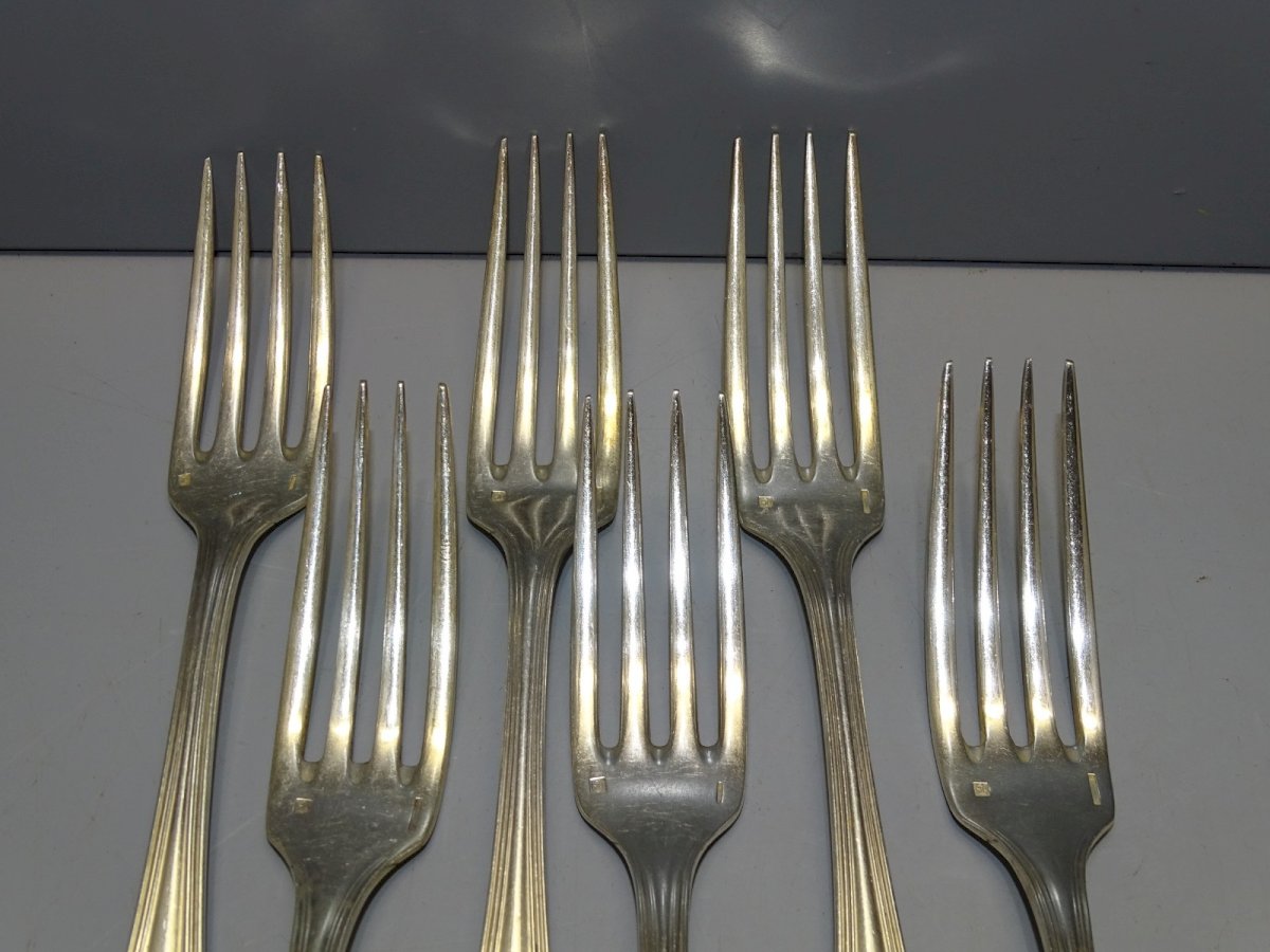 6 silver-plated metal forks by Christofle - attic finds - very good used condition - small differences in length (see photos) - Ref. 42141025/122 - Length from 21 to 21.3 cm - Weight 0.397 kg - SHIPPING via Mondial Relay or Colissimo upon request - GUARANTEED very protective PACKAGING - PLEASE TAKE A GOOD LOOK AT ALL PHOTOS as they are an INTEGRAL PART of the DESCRIPTION and ALLOW YOU TO SEE the ITEM AT ITS BEST - Condition: Used: Item that has been used. Item showing some signs of superficial wear, ...Used: Item that has been used. Item showing some signs of superficial wear, fully operational and working correctly. It may be a demonstration model or an item returned to the store after a short period of use. any possible imperfections. Type: Dinner fork Brand: CHRISTOFLE