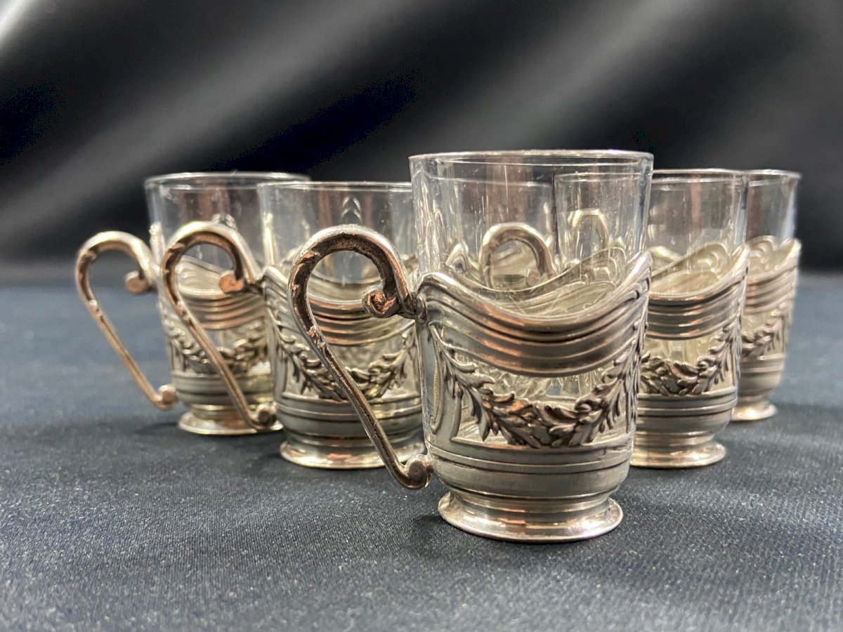 Set of 6 liqueur glasses with silver-plated metal mount in Louis XVI style, late 19th to early 20th century. Maximum dimensions: Height 5.2 cm x diameter at the rim 3.3 cm x span 5 cm. Total weight: 228 grams. I note the presence of a re-soldered handle as well as a micro "pinhead" on the rim of one glass. Ultra-secure shipping worldwide. Authenticity: Original. Type: Tableware, Kitchen. Origin: France. Subtype: Glass. Material: Silver-plated metal. Style: Louis XVI.