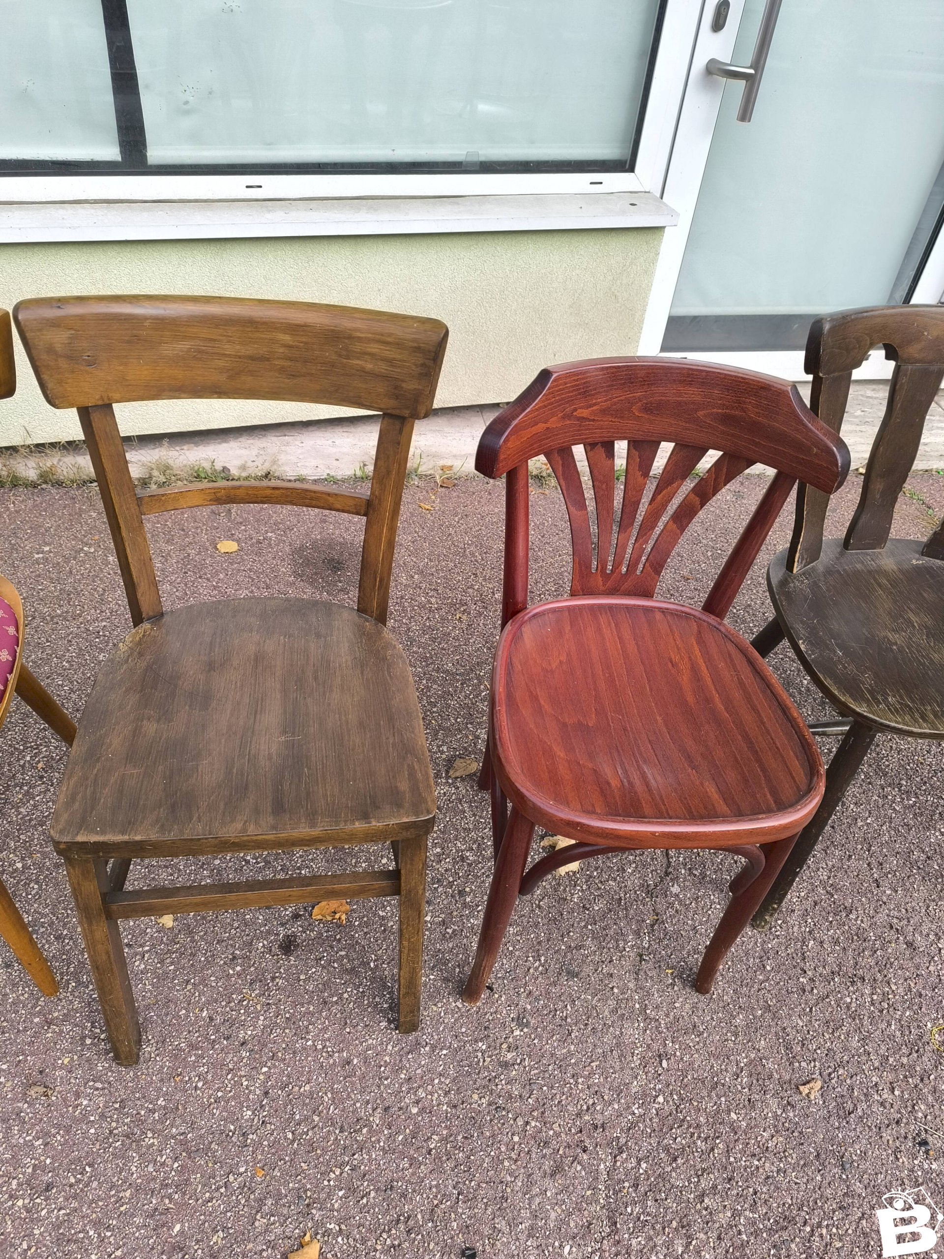 Set of 20 wooden bistro chairs with vintage cushion from the 1970s.