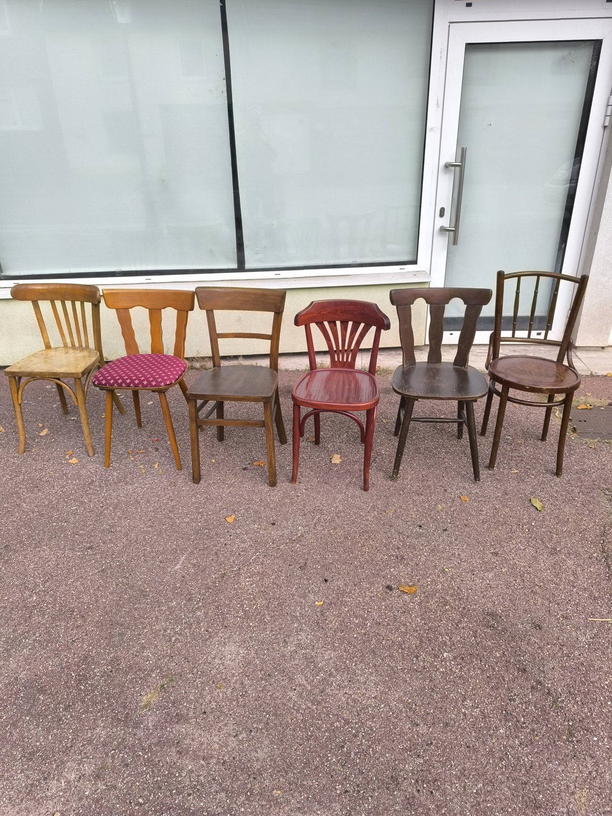 Set of 10 wooden bistro chairs with cushions, vintage 70s/80s/90s.