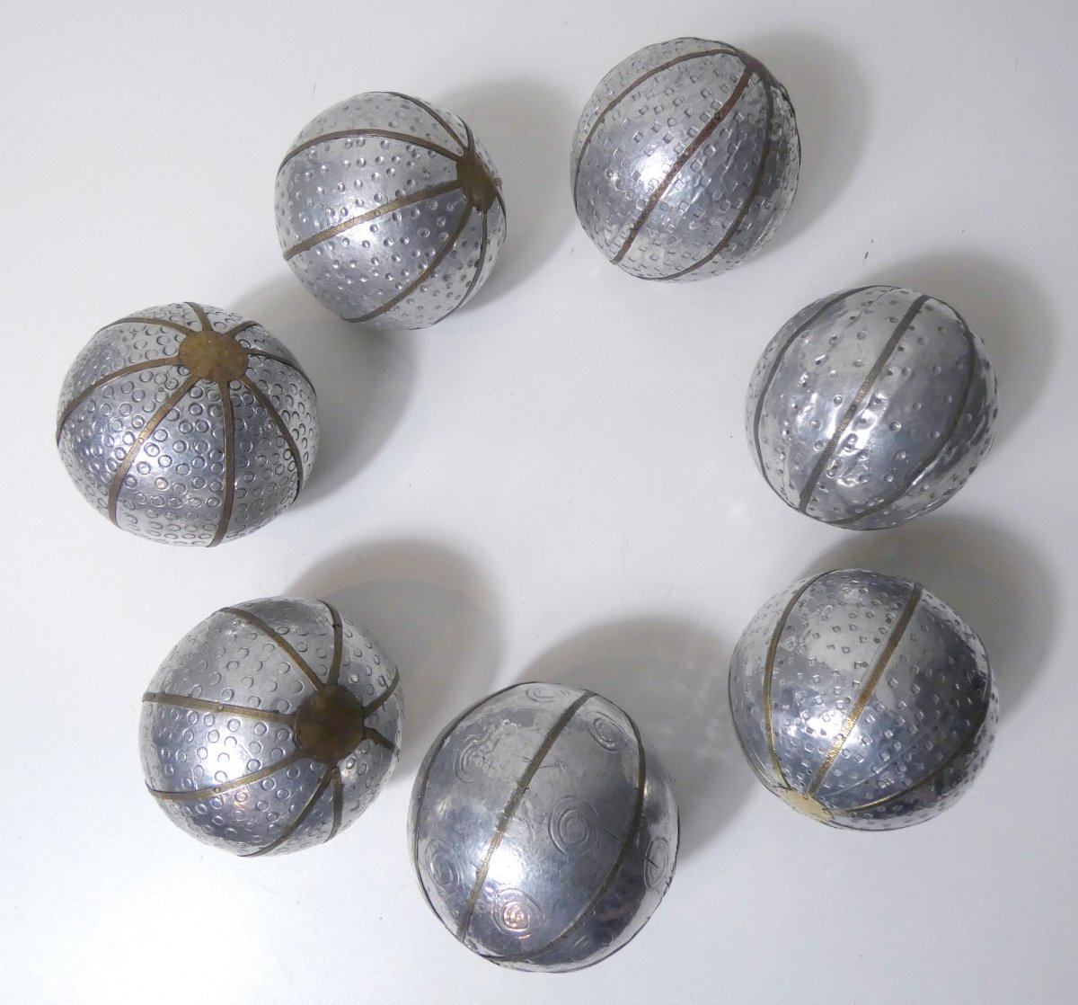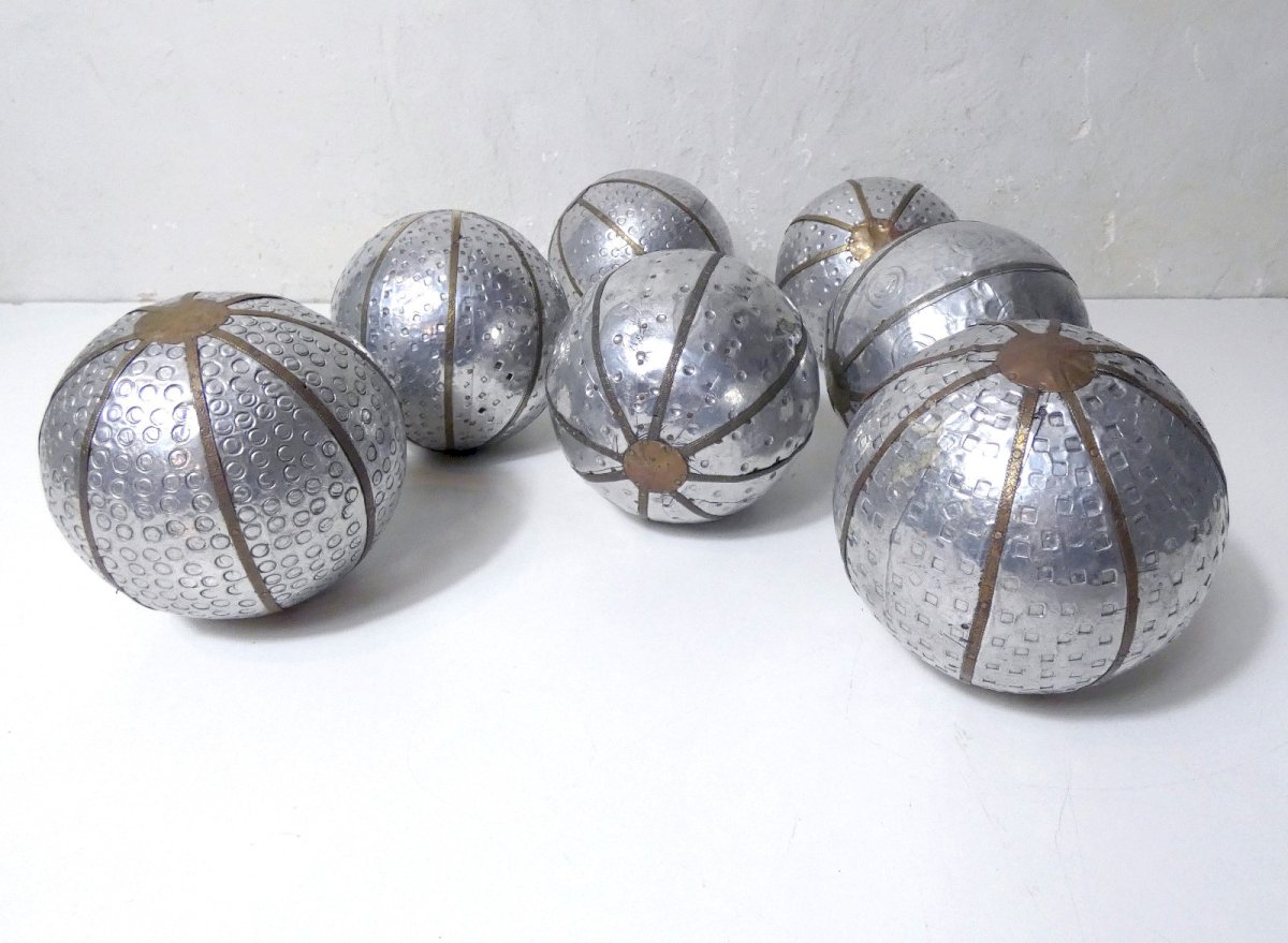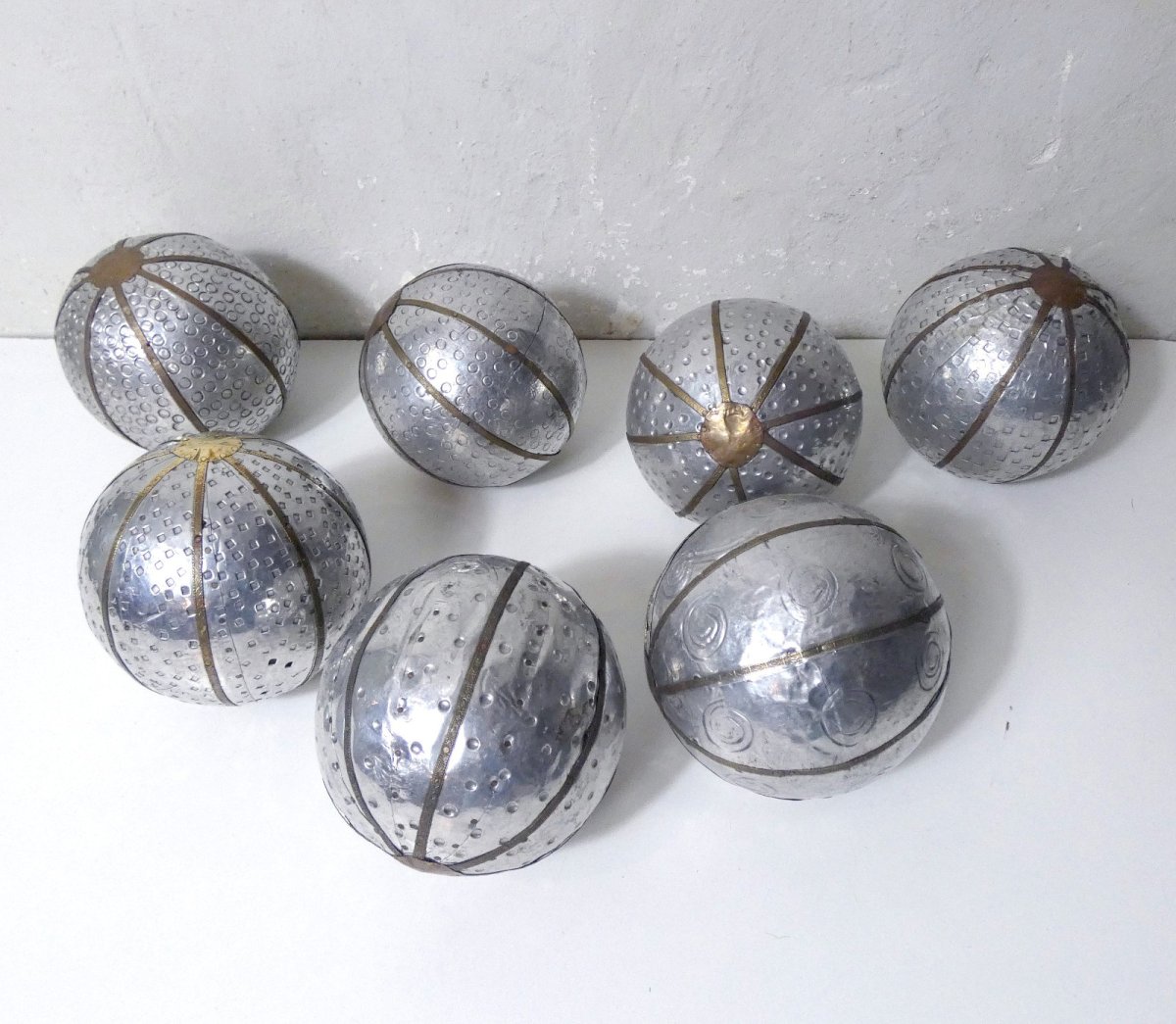 Set of 7 decorative balls in silver-plated and brass, handcrafted. Each piece is hammered and assembled by hand, revealing careful and unique workmanship. The silver-plated metal regains its luster after cleaning with Miror, highlighting the delicate bands of golden brass. They measure 12.5 cm in diameter and weigh approximately 500 g each. These decorative balls can be placed in a large dish, on a console, a shelf, or a dresser, for a chic and contemporary look. Alternatively, in an XXL glass vase with a fine fairy light garland. They are all in excellent condition. Color: Silver Type: ball Subtype: Decorative Material: Metal
