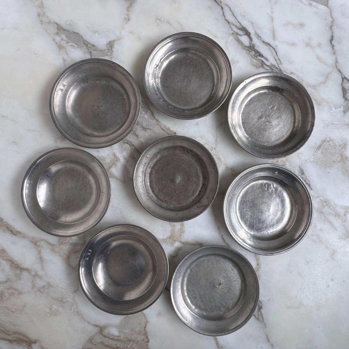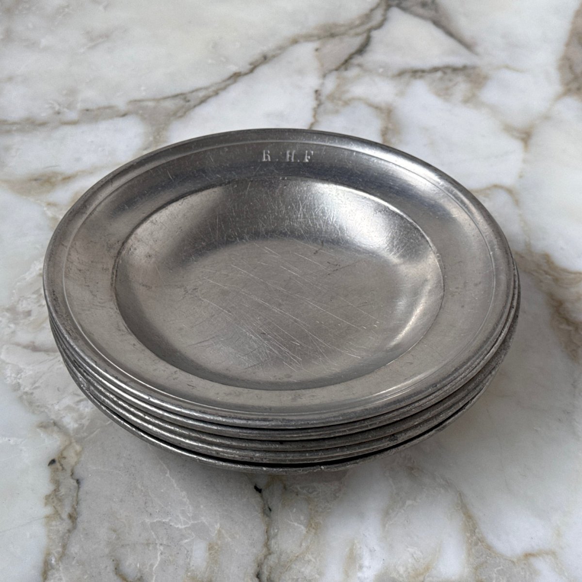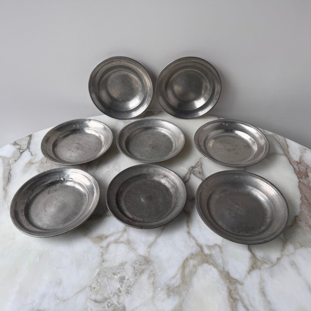 Set of 8 hollow dishes in 18th-century pewter with the initials RHF M3989. These antique dishes bear hallmarks, and "RHF" can be read on some of them. It is rare to find a complete set. In terms of condition, there are signs of wear due to use and scratches; however, the dishes remain in good condition for 18th-century pieces. Our photos allow you to appreciate the quality of the item. Please make sure to examine the photos closely. Don't hesitate to zoom in. The photos are an integral part of the description. Dimensions: Height: 3 cm Width: 19.5 cm - Different dish Height: 3 cm Width: 20 cm Total weight: 4.409 kg P: 1702490 I remain at your disposal for any questions. Type: Tableware, Kitchen Origin: France Country of origin: Metropolitan France Sub-type: Dish Height: 3 cm Material: Pewter Length: cm Width: 19.5 cm