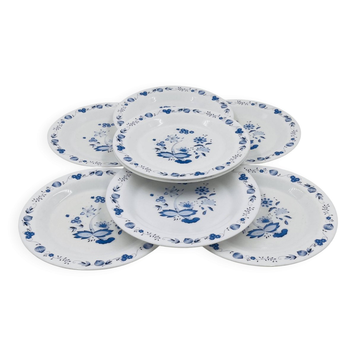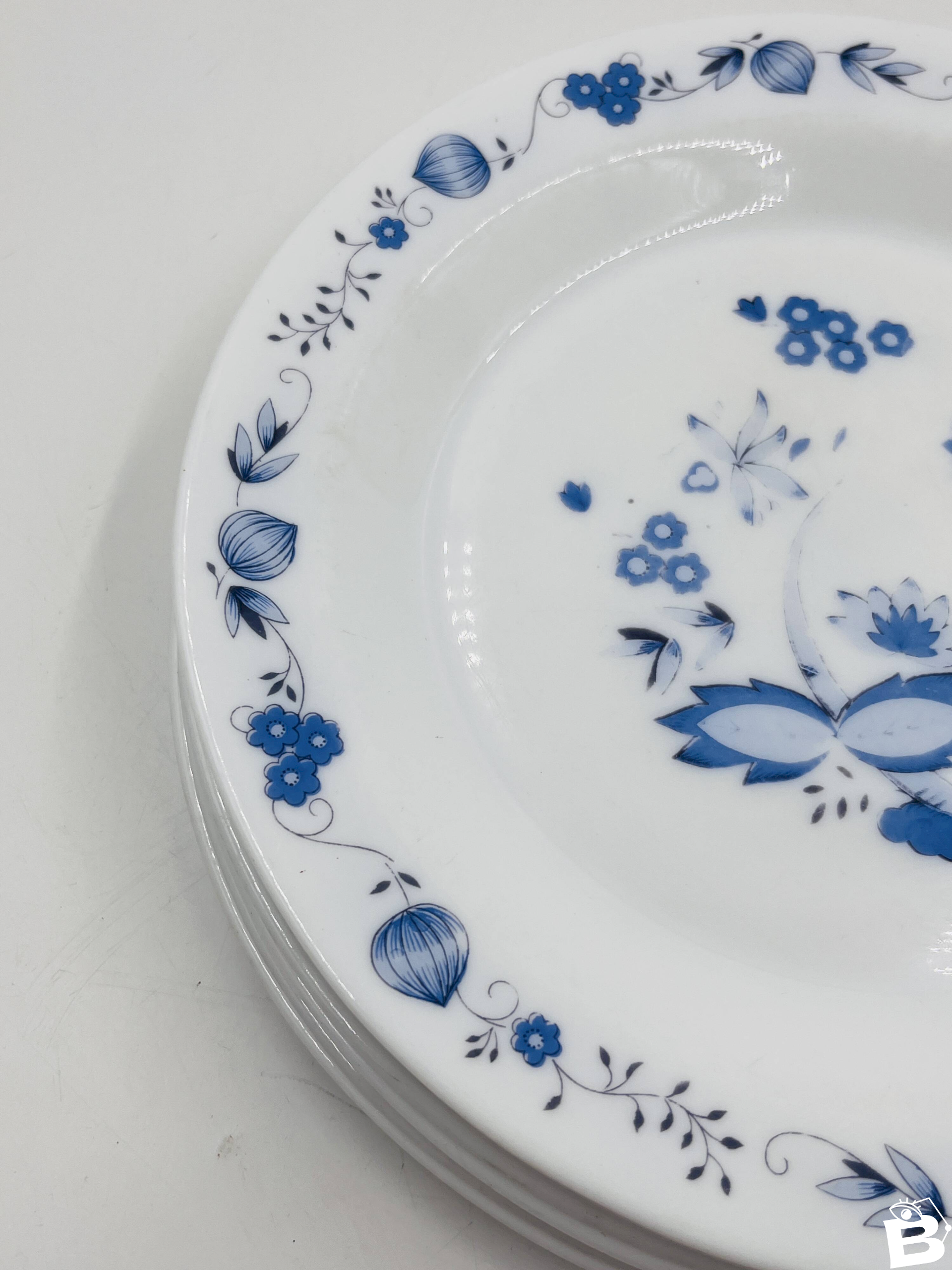 These plates are adorned with a delicate blue floral pattern that gracefully unfolds across the immaculate white surface, creating a perfect harmony between colors and design that will enhance all your meals.
