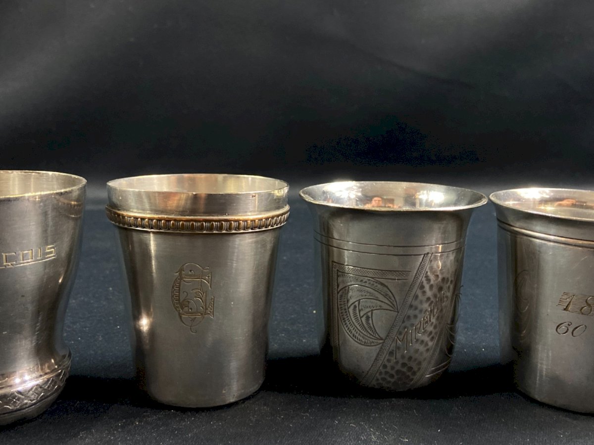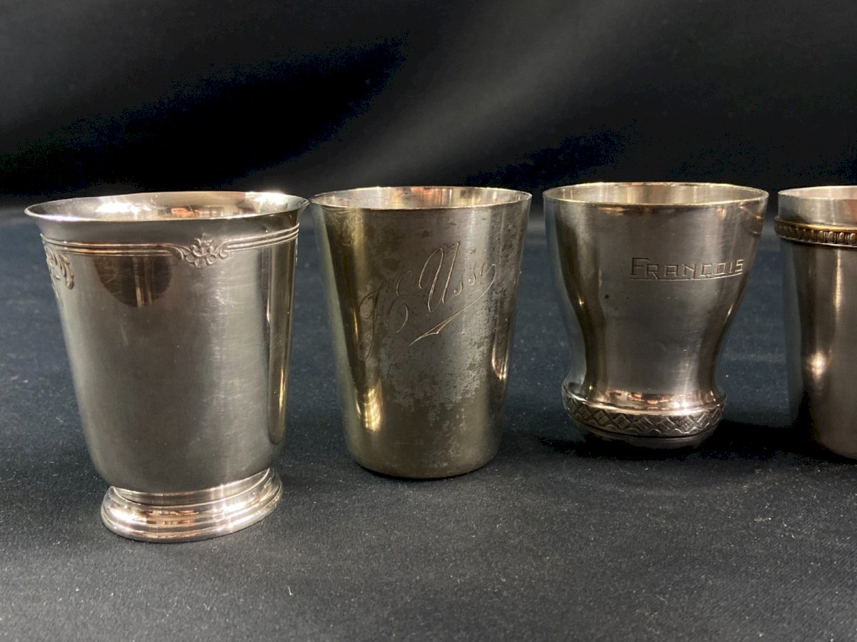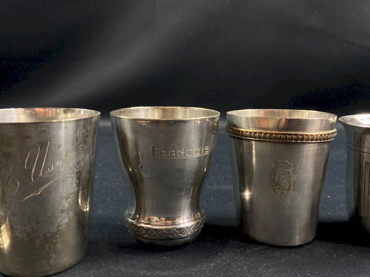 Set of 9 silver-plated cups Dimensions: Between Height 6.5 x diameter 5.3 cm and Height 8.1 x diameter 6.8 cm I note the presence of various signs of wear, small deformations, and other fine usage scratches The internat example AMC 119 has a small crack at the bottom reserve Total weight: 831 grams Ultra-secure shipping worldwide - Order pickup available by appointment, 7 rue Notre-Dame 18000 Bourges. - Possibility of grouping within the same package: please contact me in advance so I can calculate your optimized shipping costs. Authenticity: Original Type: Tableware, Kitchen Origin: France Country of origin: France Subtype: Cup Material: Silver-plated