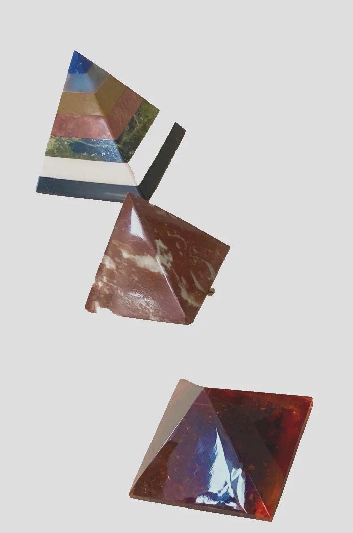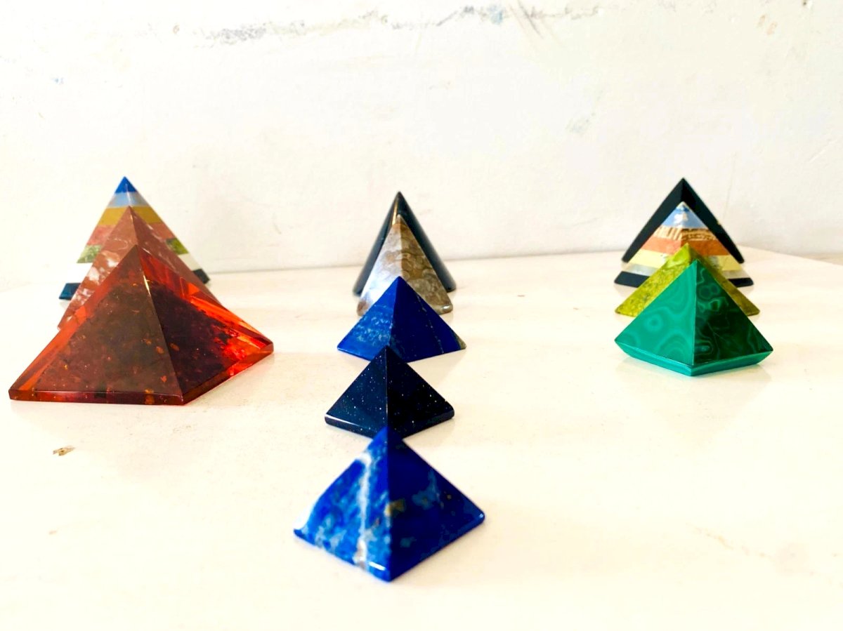 Set of 12 ancient stone pyramids made of synthetic glass, malachite, obsidian (small flakes), red jasper, lapis lazuli, and silver obsidian. Dimensions: H from 10 cm to 4 cm / L from 9 cm to 4 cm. Era: 20th century. Type: Decorative object. Period: 20th century design. Origin: France. Country of origin: France. Height: 10. Length: 4. Width: 4.