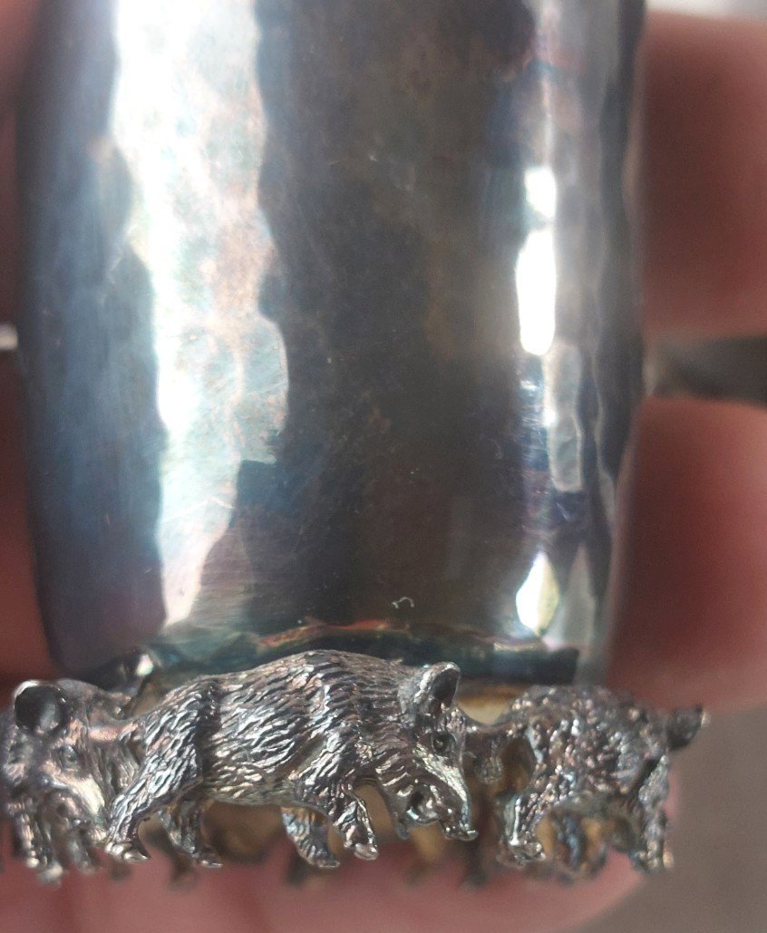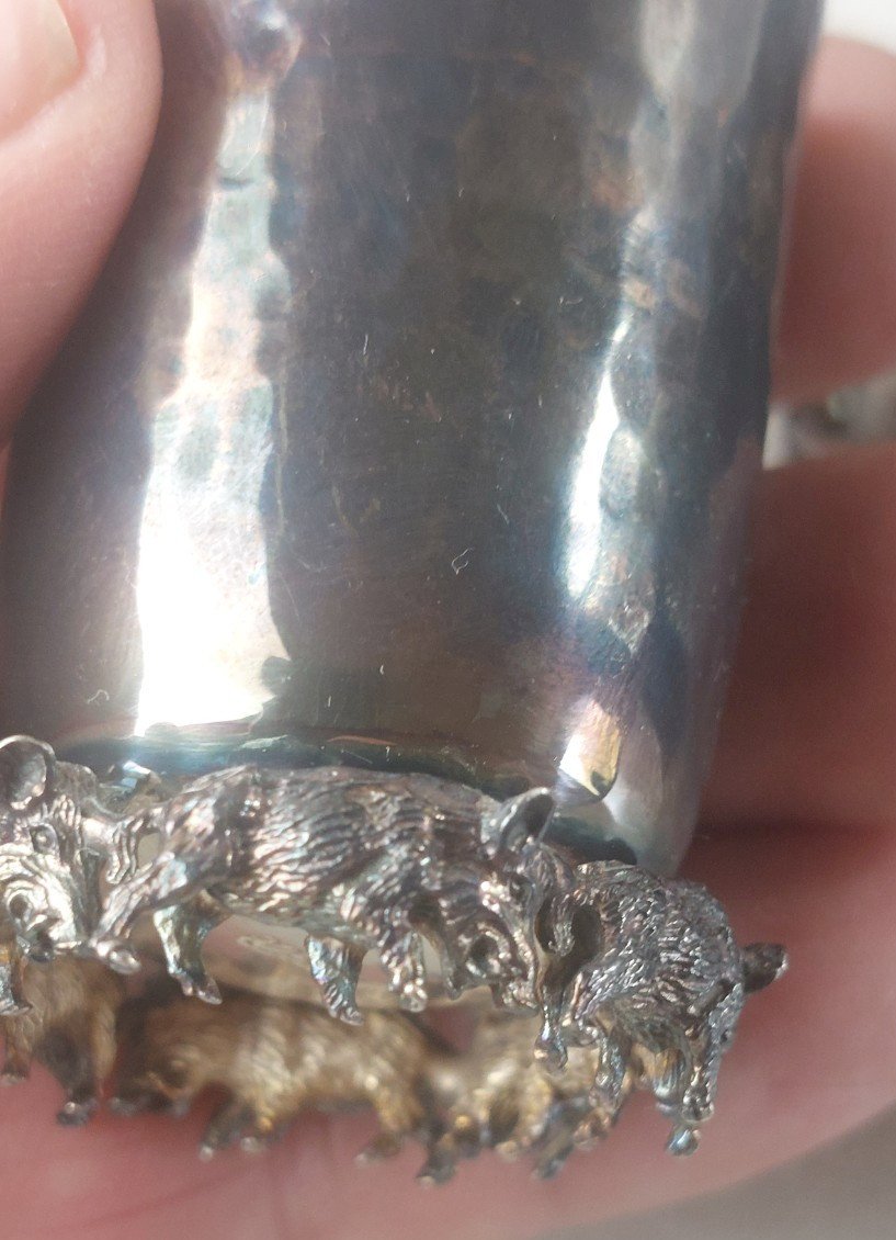Set of antique cups / goblets, Emil Hermann Waldstetten, made of solid silver with legs decorated with wild boars in good condition marked 925 + hallmarks diameter 3.5 cm height 5.7 cm total weight 190.90 gr see photos Check out my other items! discount on shipping costs for combined purchases Country of origin: Germany Authenticity: Original Brand: Emil Hermann Waldstetten Type: Tableware, Kitchen Subtype: Glass Material: Solid silver