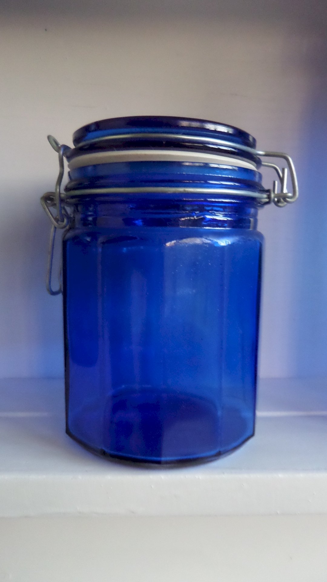 1980s, set of 5 kitchen jars, variable sizes, with airtight lid. Cobalt Blue glass jars.