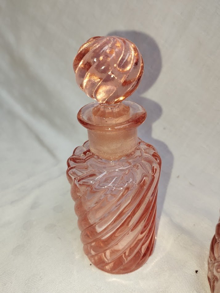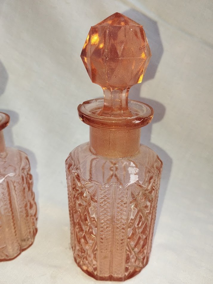 Their soft, luminous pink hue, combined with the pressed glass work, makes them refined decorative objects, perfect on a vanity, a shelf, or integrated into a chic vintage composition.