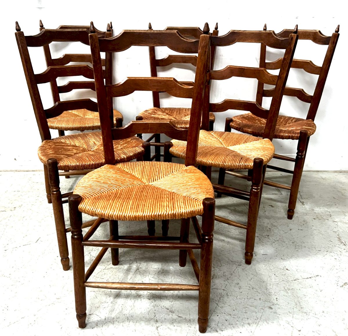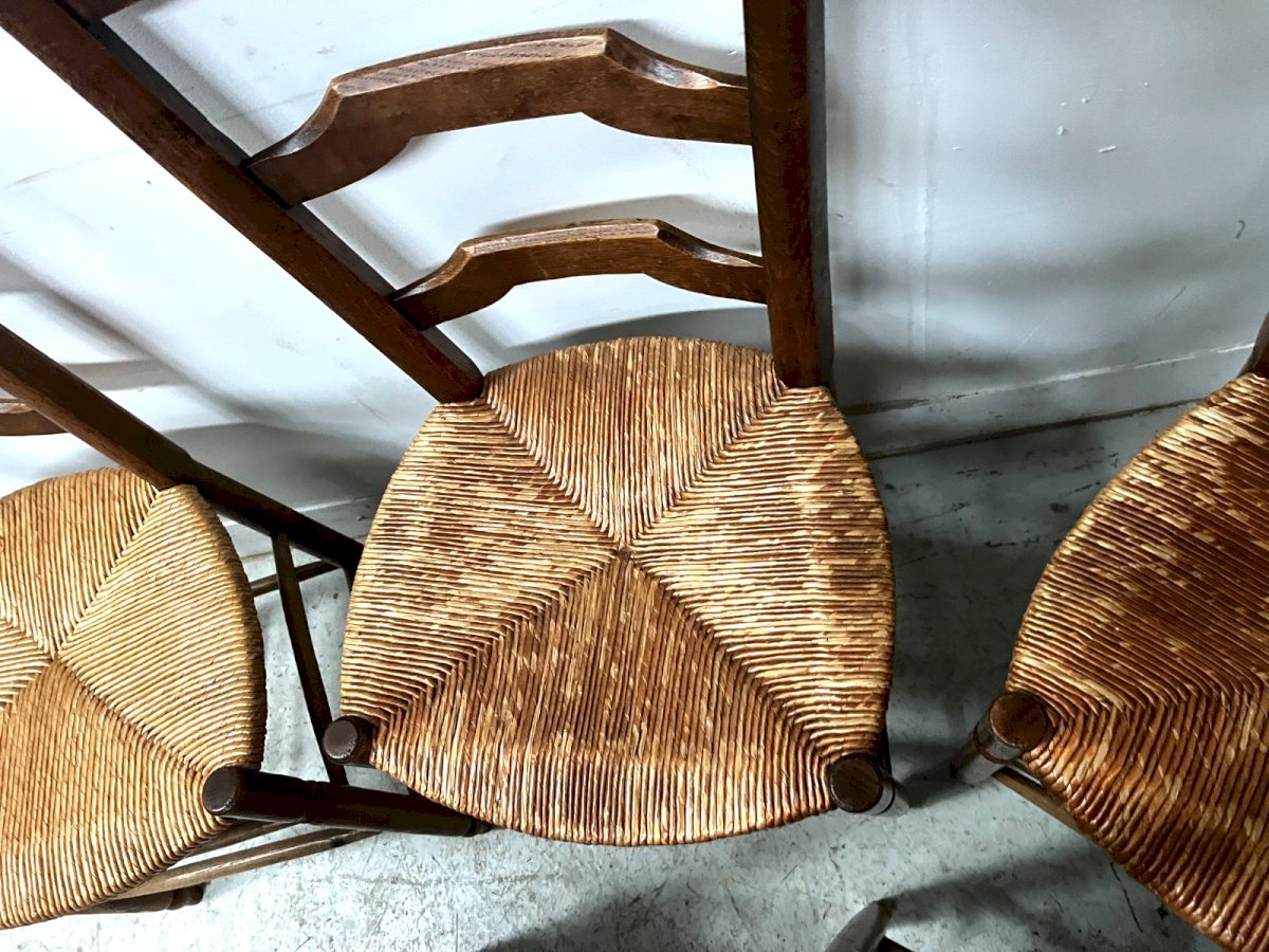 Set of six rustic beech chairs with a patina. Straw seats, three with new straw. Backs with three slats. Signs of wear on the other three straws, see photos. One chair restored at the back. Dimensions: H 93 x W 43 x D 40 cm. 20th century. Number of pieces: 6. Origin: France. Period: 20th century design. Country of origin: France. Height: 93. Material: Beech. Length: 43. Width: 40.