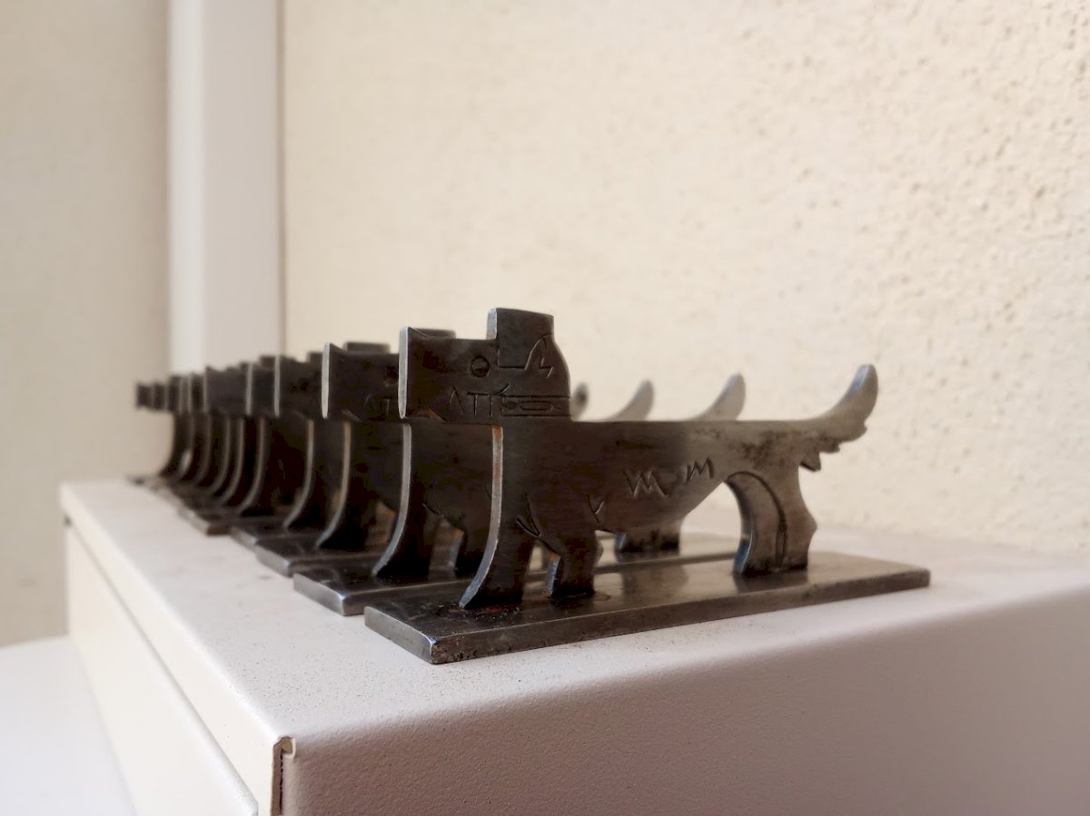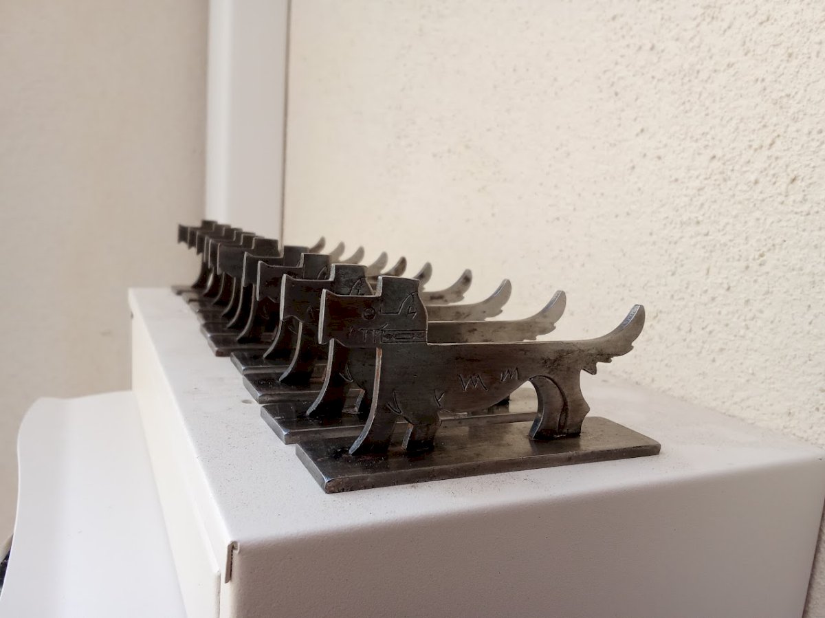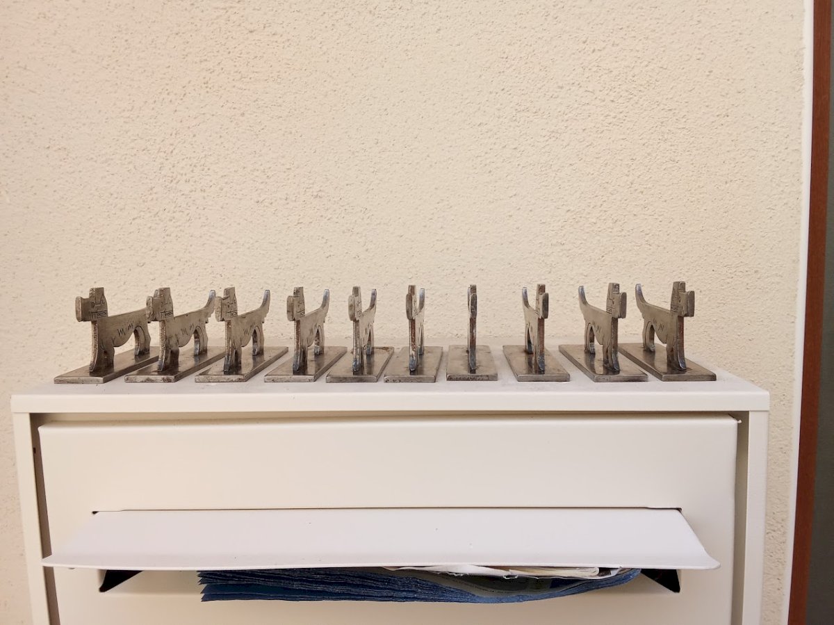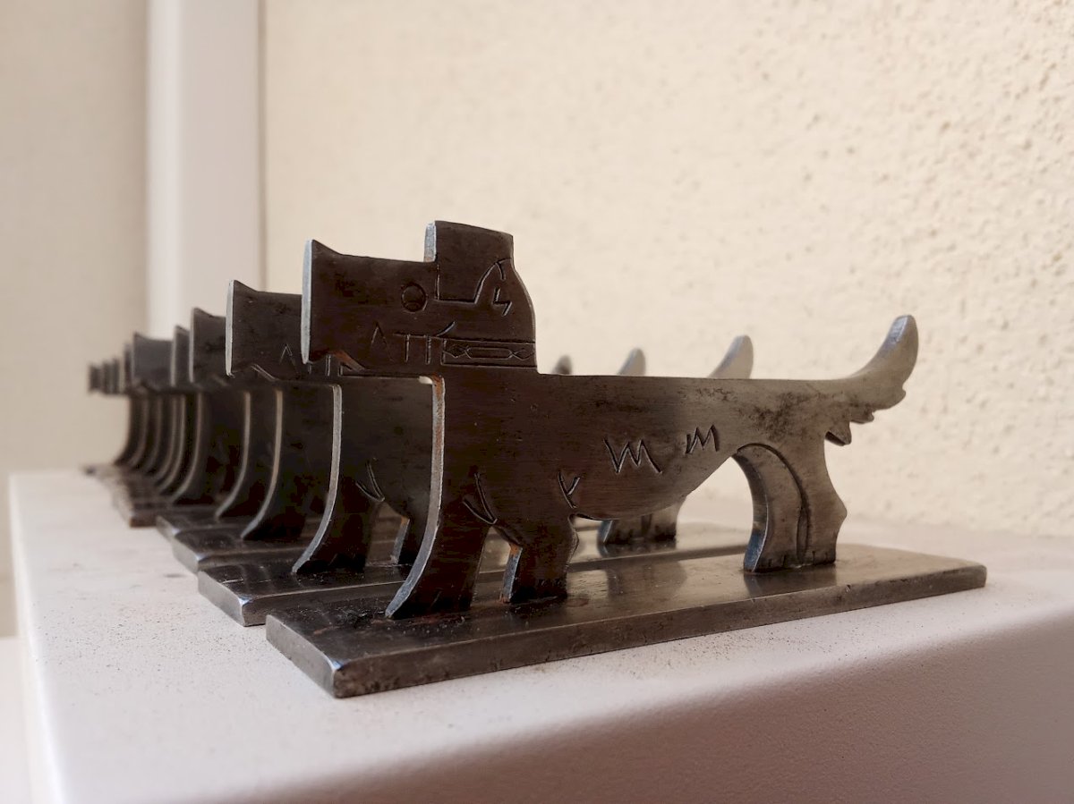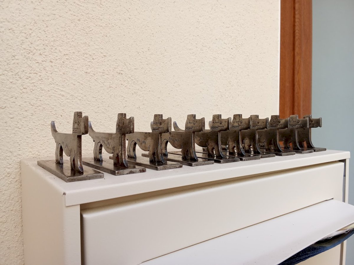 6 vintage dachshund knife holders – Patinated silver-plated metal
