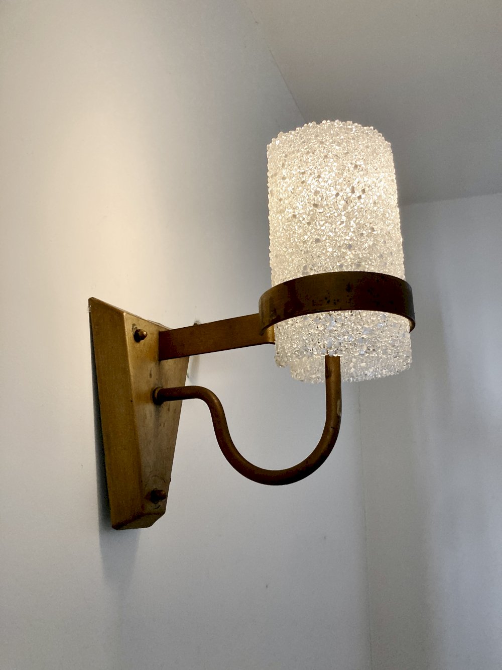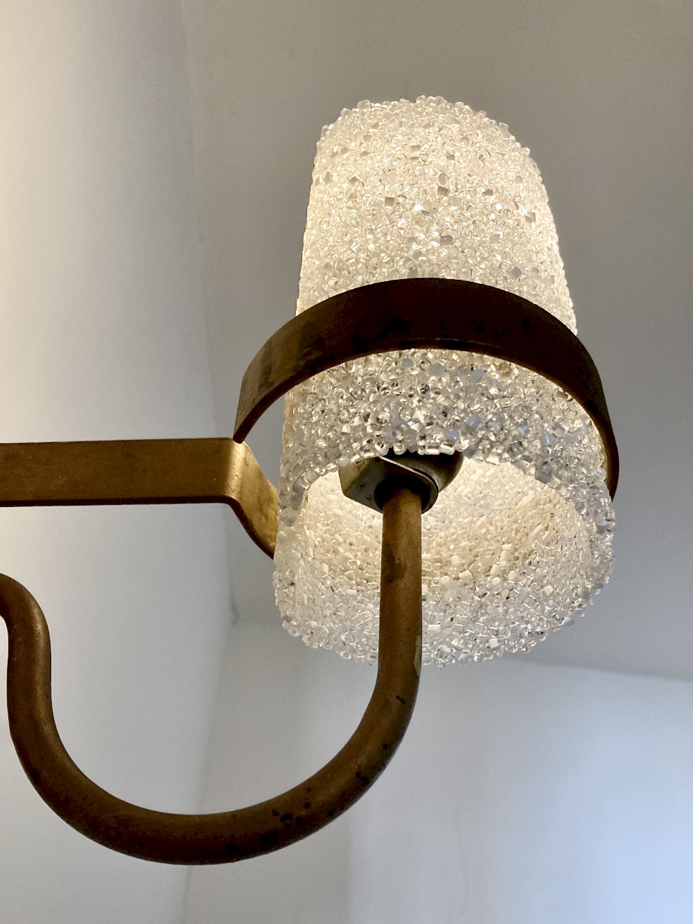 Each piece consists of a structure made of painted metal in its original gold patina, paired with a cylindrical diffuser in Perspex (PMMA acrylic) with a "crushed ice" effect. This iconic material from the design of the 60s and 70s provides a soft and sparkling light.