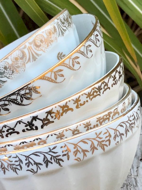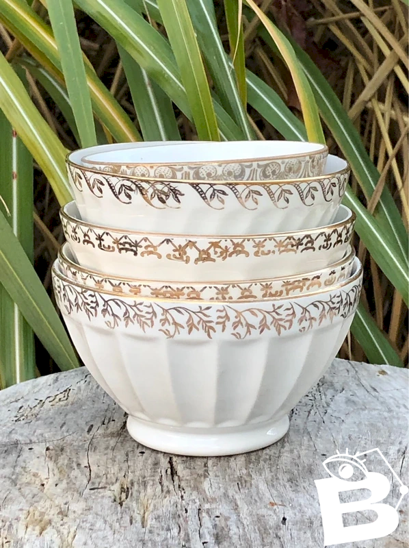 Set of vintage retro porcelain bowls in excellent condition, except for the smallest one which is cracked but still watertight, see the last 2 photos. Height 5, 5.8, 5.8, 5.8, and 6.8 cm. Diameter 9, 10.5, 11, 11, and 11.8 cm.
