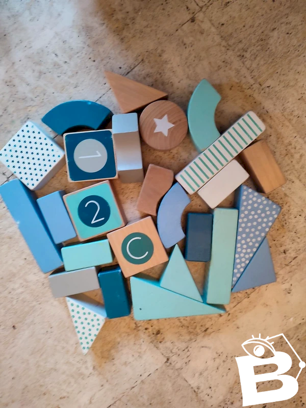 Set of wooden blocks of different shapes and colors in good condition.