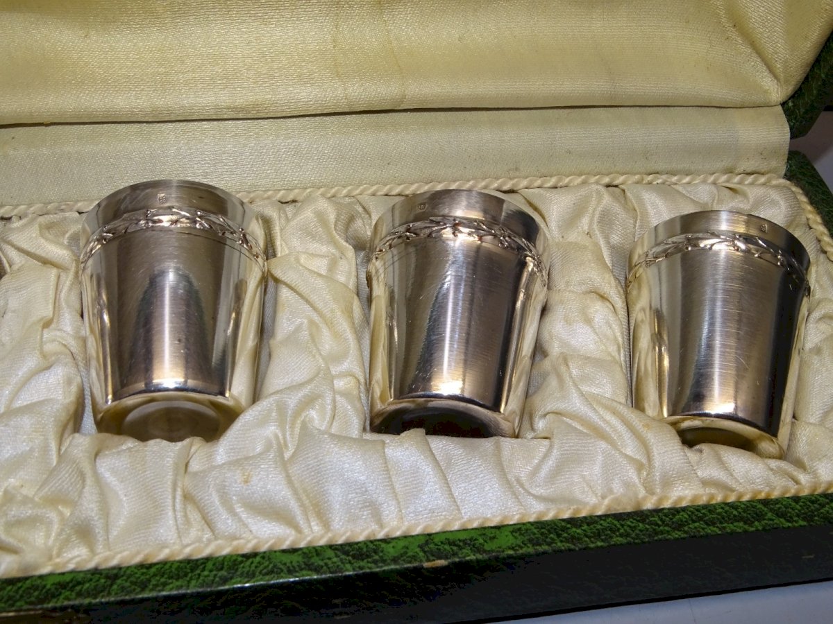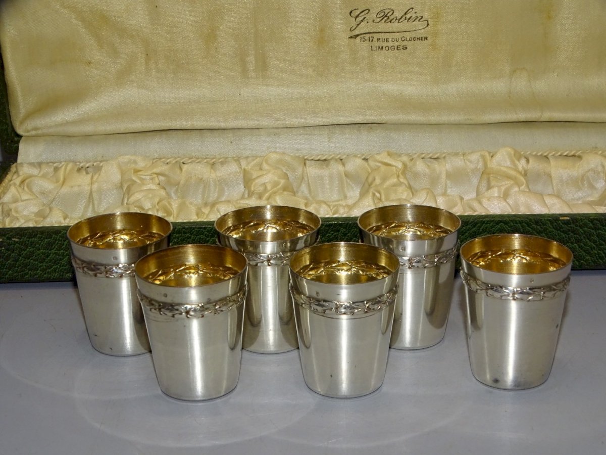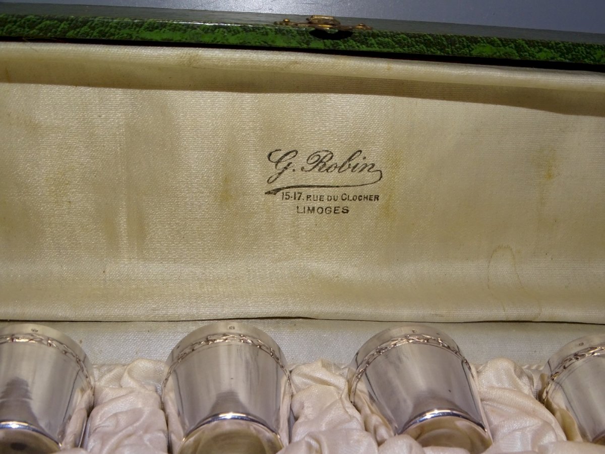 6 silver-plated shot glasses with a goldsmith's hallmark, it seems to be P.F. but subject to confirmation - in a green paper-covered case - the case has some wear and tear and small dark marks where the glasses were located - the silver-plated metal is in good used condition (see photos) - finds from an attic - Ref. 42141025/26 - Case dimensions 32.3 x 9 cm Height 5.5 cm - Glasses Height 3.9 cm Diameter 3.3 cm - Total Weight 354 g - SHIPPING via Mondial Relay OR Colissimo possible upon request - GUARANTEED very protective PACKAGING - PLEASE TAKE A CLOSE LOOK AT ALL the PHOTOS as THEY ARE AN INTEGRAL PART of the DESCRIPTION and ALLOW you to SEE the ITEM BEST - Material: Metal