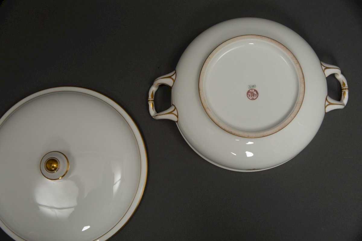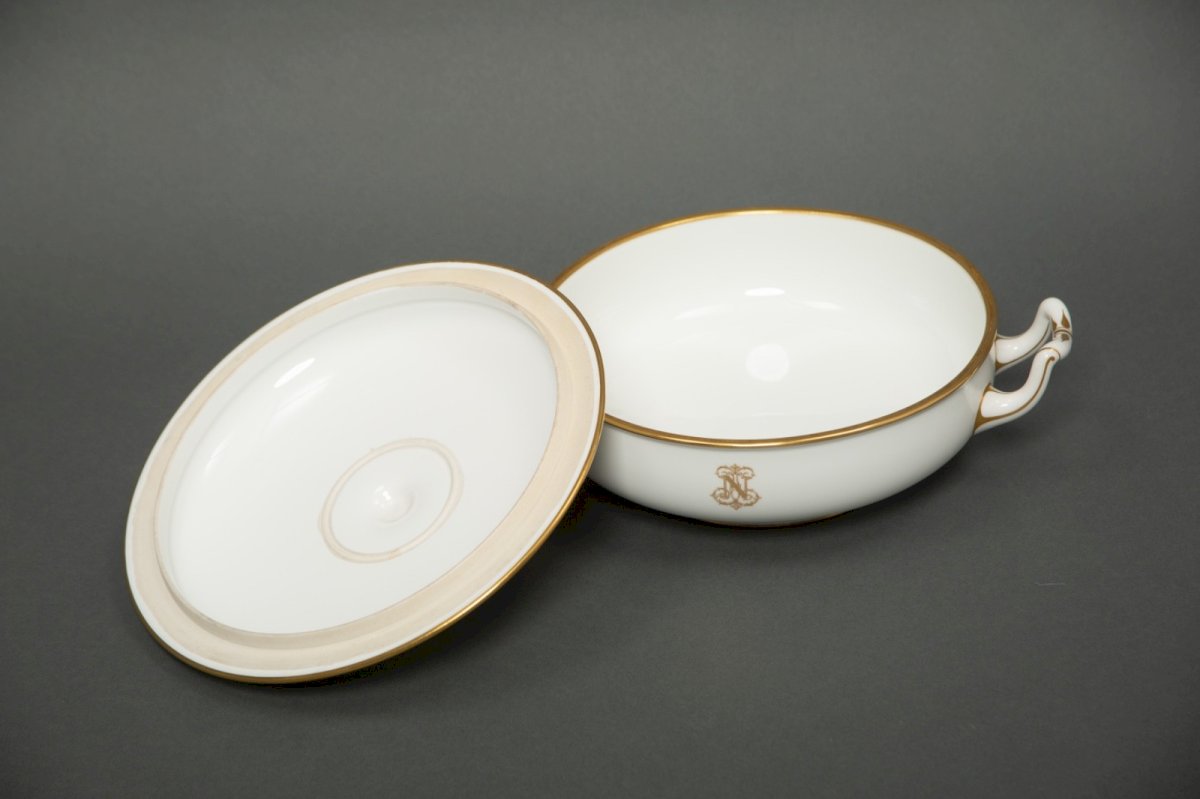 Authentic white porcelain soup tureen from the Sèvres Manufacture, late 19th century. This elegant piece is adorned with the finely gilded imperial monogram "N," framed by a delicate gold fillet highlighting the lid, rim, and handles. Its sober and balanced design reflects the aesthetic inspired by the vocabulary of imperial decor while retaining a great decorative modernity. The harmonious proportions and purity of the porcelain make it an ideal piece both as a centerpiece and in a display cabinet. The visible red and green marks on the underside confirm its production by the Sèvres Manufacture at the end of the 19th century. Dimensions: Diameter: 19 cm Width with handles: 25 cm Condition: Excellent overall condition. No chips, no cracks, no restoration. Elegant and decorative soup tureen, ideal for collectors of French porcelain or enthusiasts of imperial-inspired objects. Type: Tableware, Kitchen Origin: France Sub-type: Soup Tureen Country of origin: France Material: Porcelain