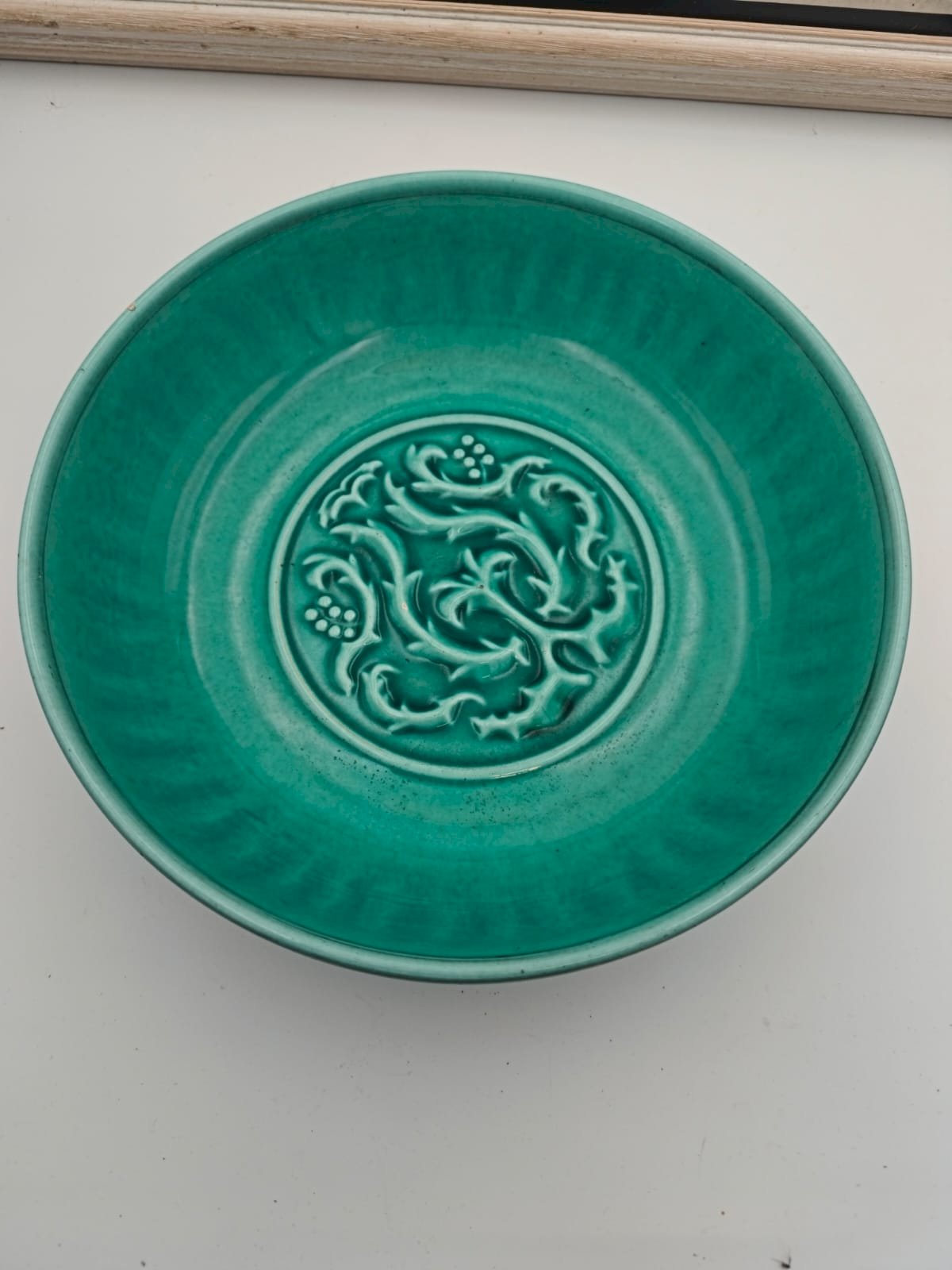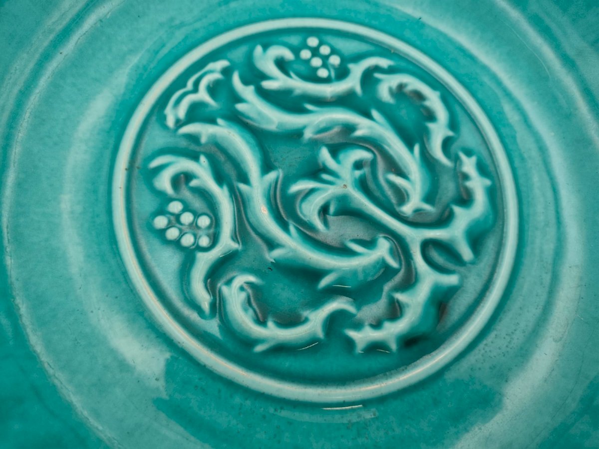 Decor: Central relief pattern (scrolls, leaves, and clusters of fruits/grapes) typical of the era.