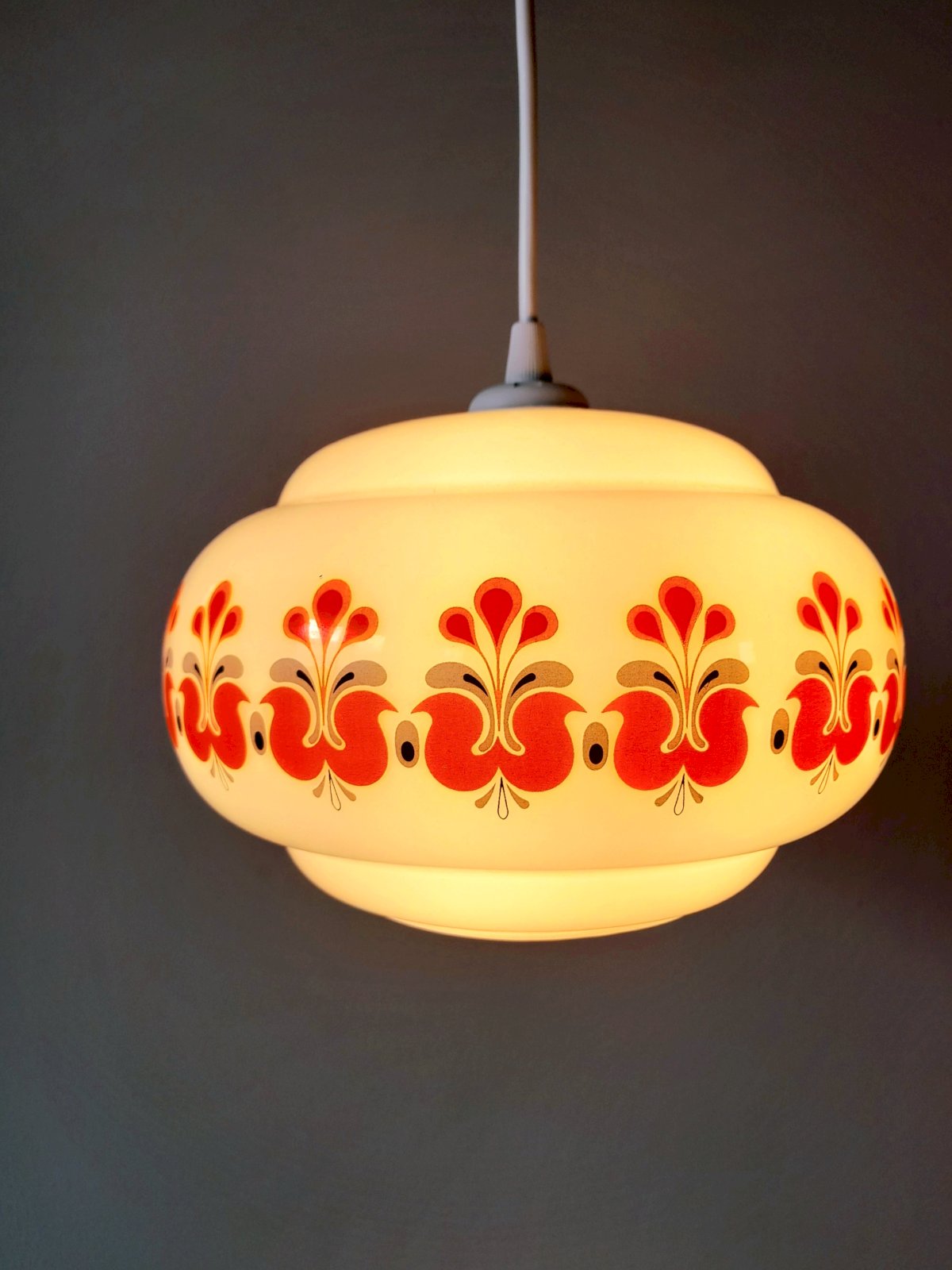 White opaline screen-printed pendant light, decorated with birds, dating from the 1970s.