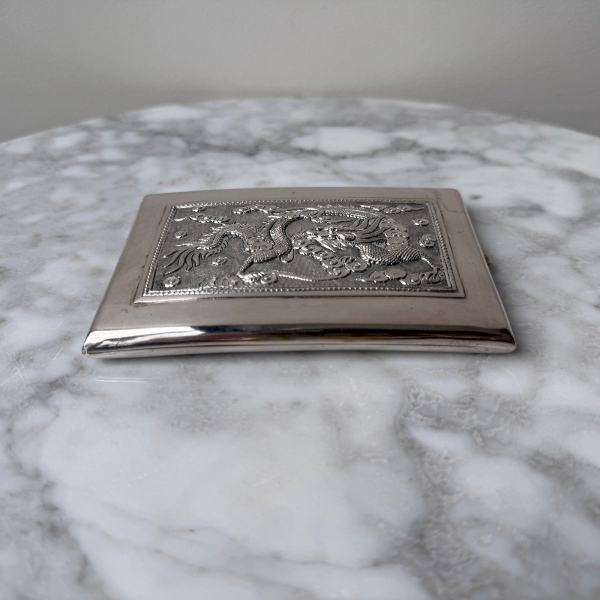 Silver Cigarette Case Indochina Southeast Asia Dragon Decoration M3712 This cigarette case is a finely crafted Indochinese work, delicately engraved. We have not found a hallmark, but it is indeed made of silver. Regarding its condition, there are fine scratches due to use. Our photos allow you to appreciate the quality of the object. Please pay attention to the details in the photos. Feel free to zoom in. The photos are an integral part of the description. Dimensions: Height: 11.5 cm Width: 7.8 cm Depth: 1.2 cm P: 1628823 I remain at your disposal for any questions. Type: Showcase object, Decorative Origin: Asia Sub-type: Cigarette case Height: 11.5 cm Material: Solid silver Length: cm Width: 7.8 cm