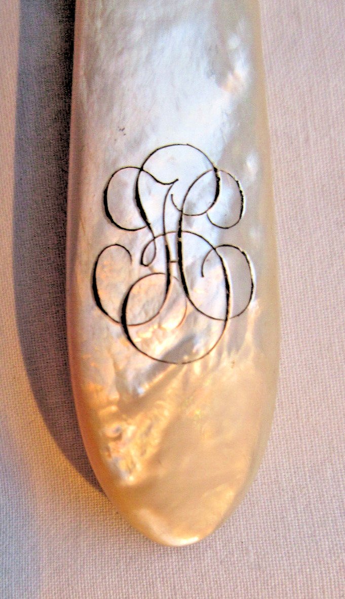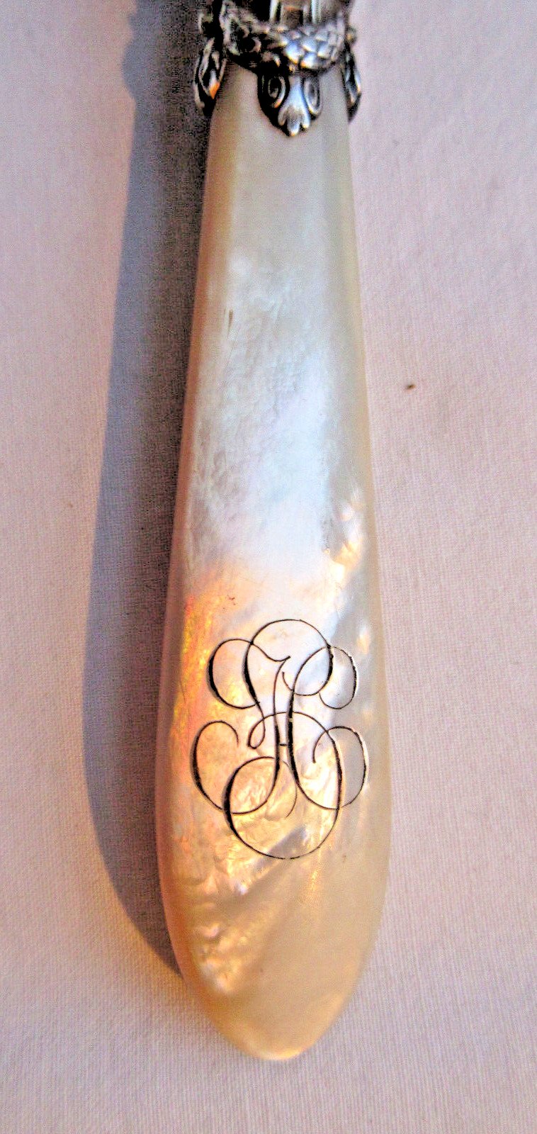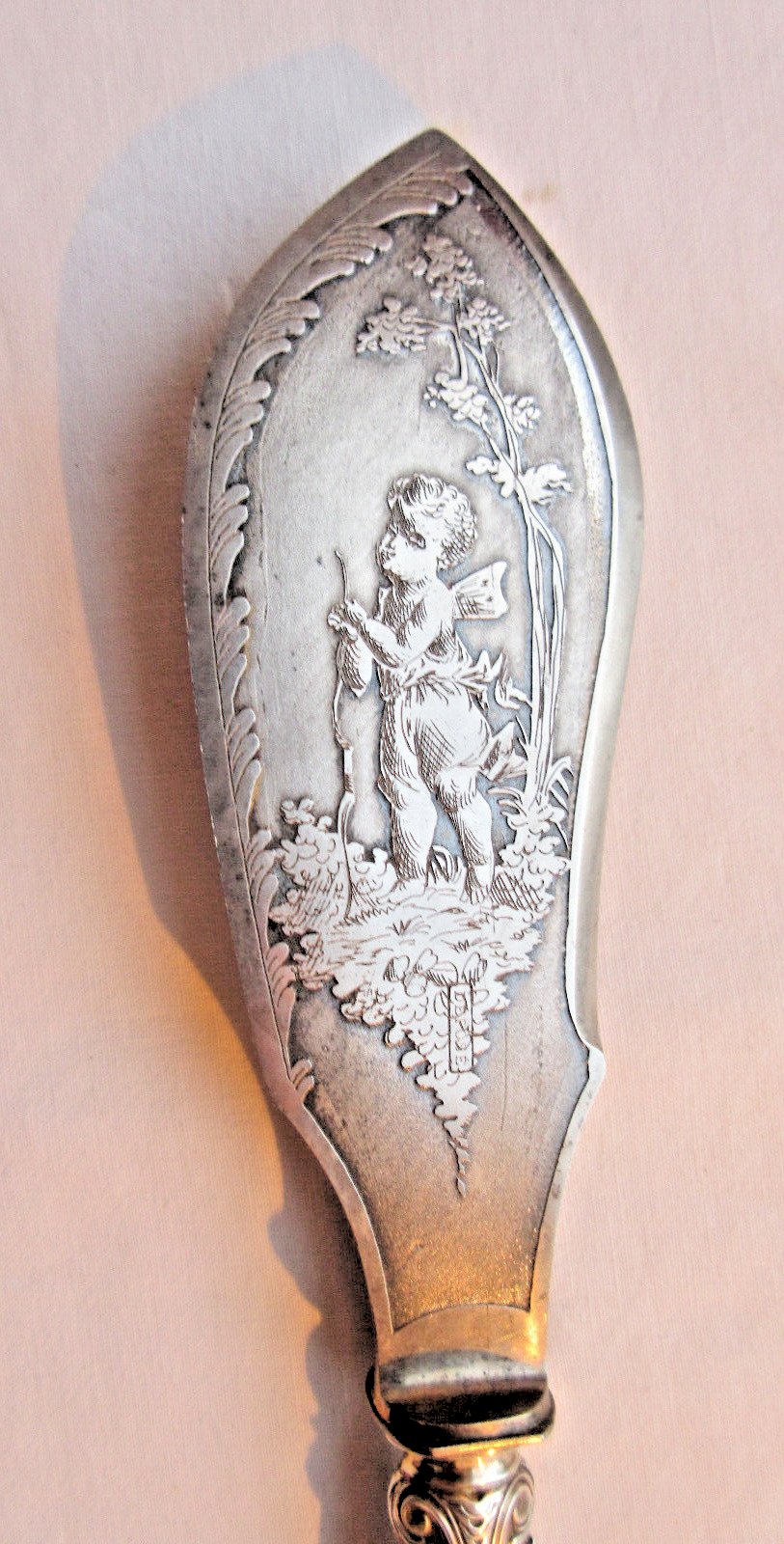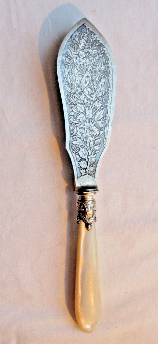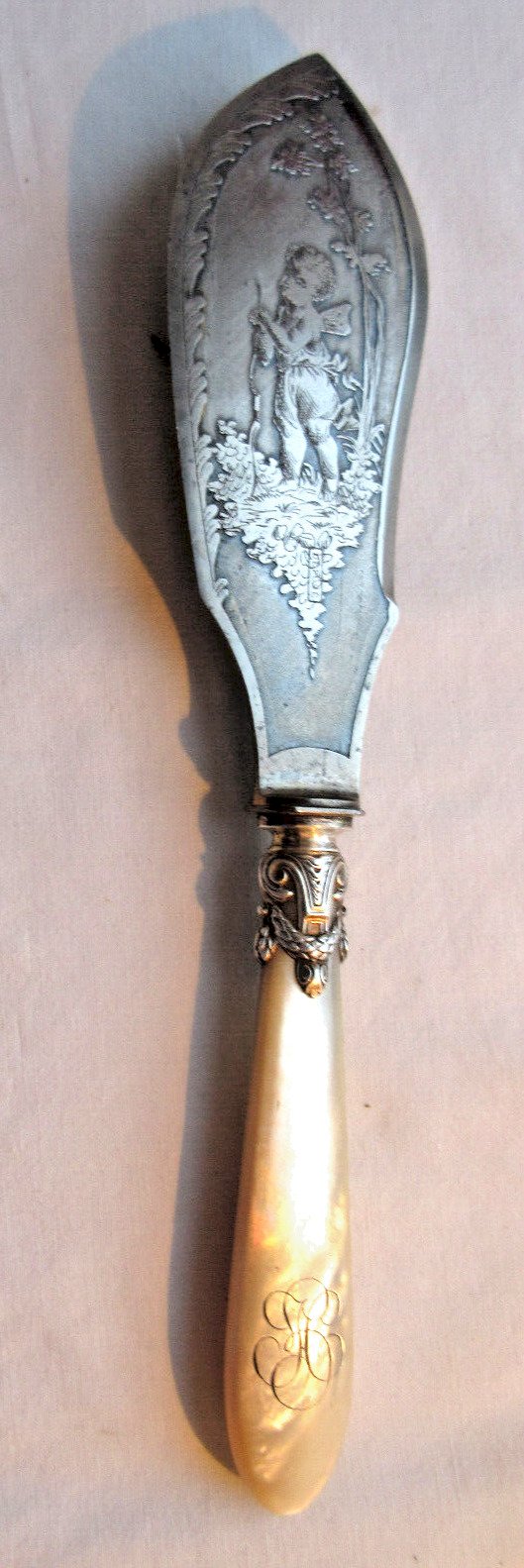 Sale worldwide. Cake server: Napoleon III. Superb antique metal and mother-of-pearl server. The metal part appears to be steel. One side functions as a knife. It is decorated with a putto under the trees on one side and a dragonfly among flowers and leaves. The handle is made of mother-of-pearl engraved with a monogram that could be JCH. Length: 25 cm, Width: 5 cm. Very good condition. The photos complement the description. Authenticity: Original Type: Tableware, Kitchen Origin: France Sub-type: Ladle, Server Style: Napoleon III Material: Silver-plated Metal.