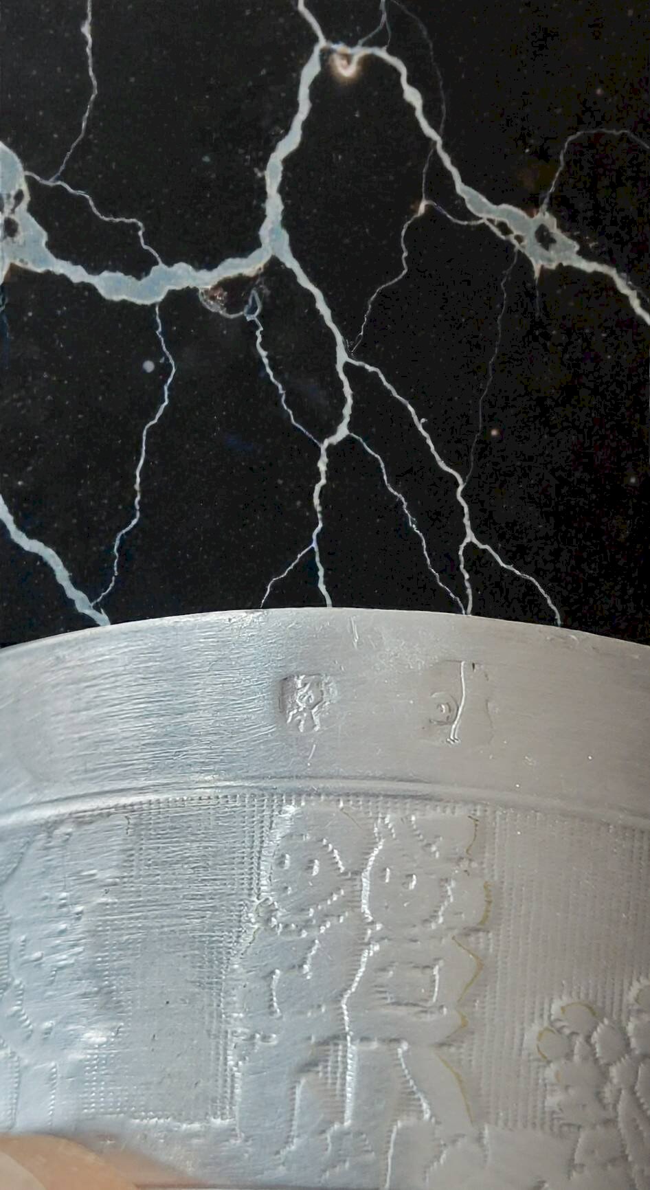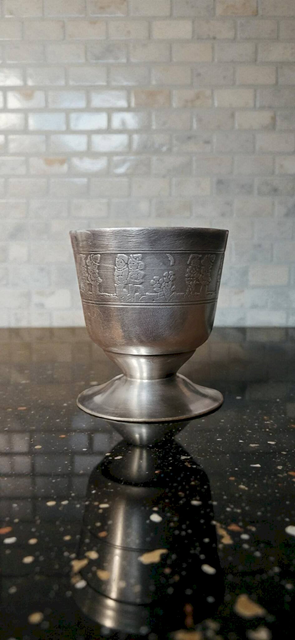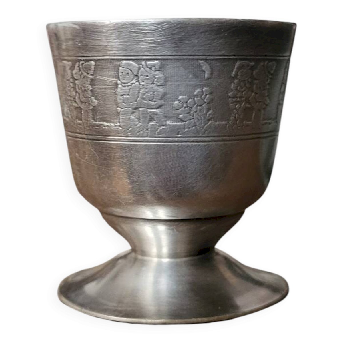 Silver metal egg cup: Flower garlands + Laughing Jean & Crying Jean