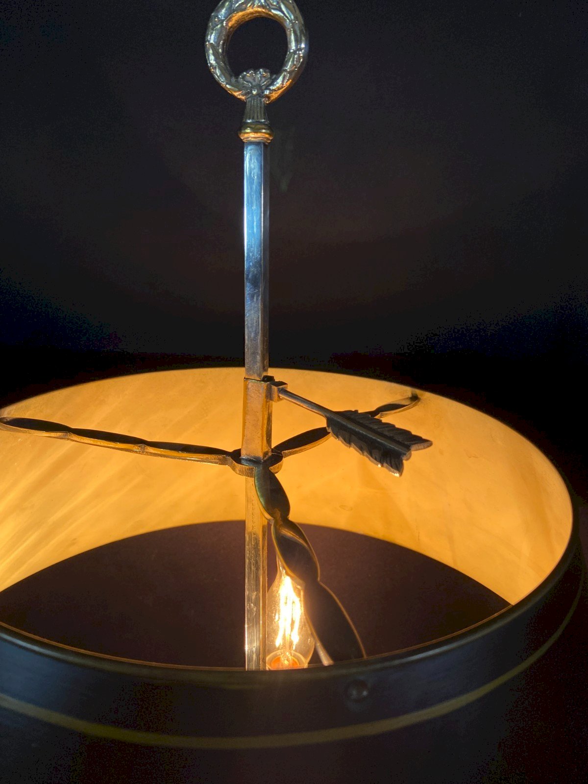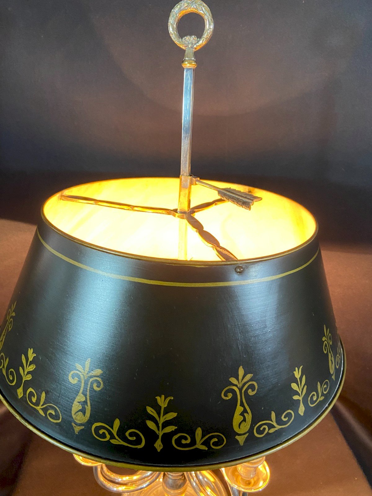 Silver-plated metal bouillotte lamp with 3 lights in the shape of hunting horns and a painted sheet metal shade in the Louis XVI / Empire style, 20th century. Beautiful luminosity with silvering. The light arms take on an elegant shape resembling hunting horns, a direct reference to the decorative art of the 18th century, combining aristocratic symbolism and neoclassical refinement. Functional electrification. Maximum dimensions: Height 59.3 cm x shade diameter 34 cm. Weight: 2234 grams. Slight deformation at the level of the arrow-shaped fastening screw allowing height adjustment of the shade. Sockets with candle sheath showing surface wear. Bulbs not provided. I will only note minimal signs of use. Shipping worldwide. Authenticity: Original. Type: Showcase item, Decorative. Origin: France. Subtype: Lamp, Lantern. Country of origin: France. Material: Silver-plated metal. Style: Napoleon, Empire.