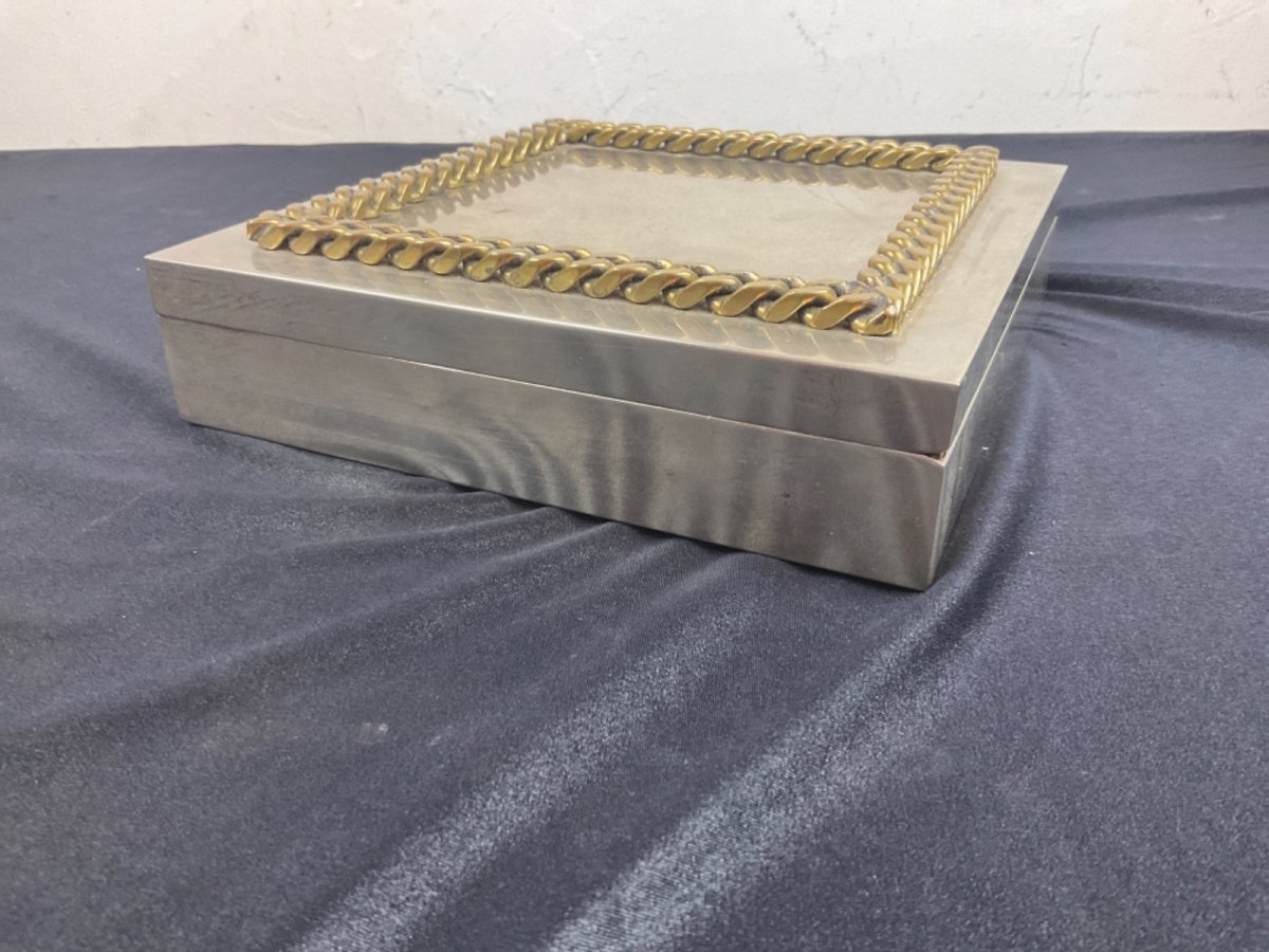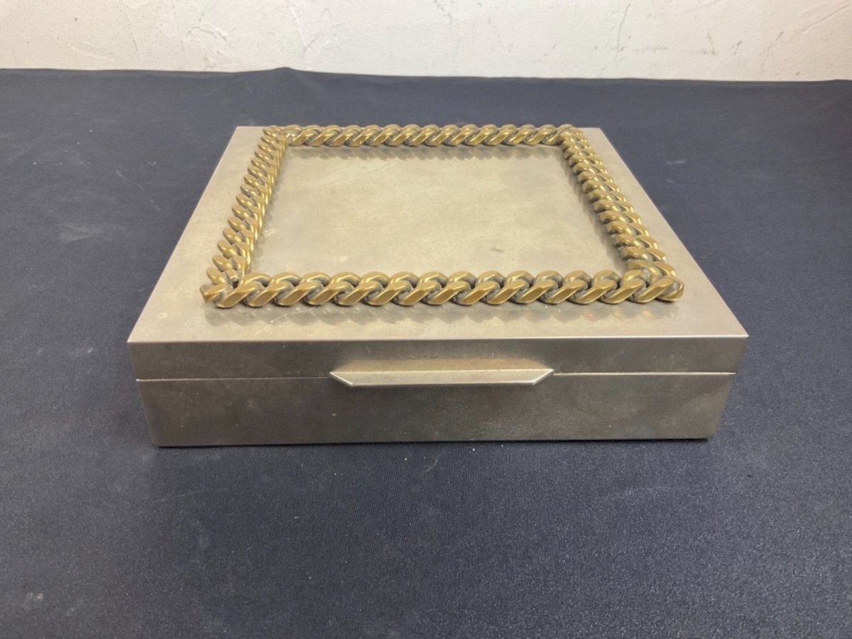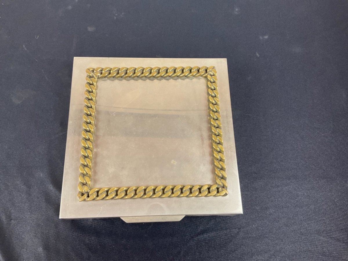 Silver-plated metal box by Jean Desprès, Gucci. Please note the hinge no longer holds. Dimensions: 18.5 x 18.5 cm Height: 4.5 cm Authenticity: Original Type: Showcase item, Decorative Brand: no brand Origin: France Period: Art Deco Subtype: box Material: silver metal