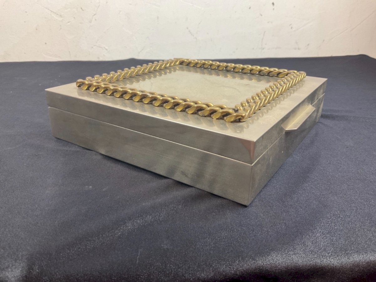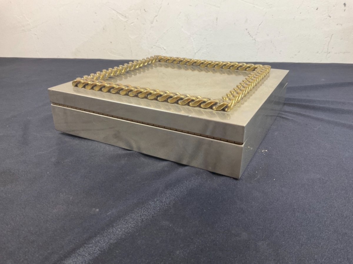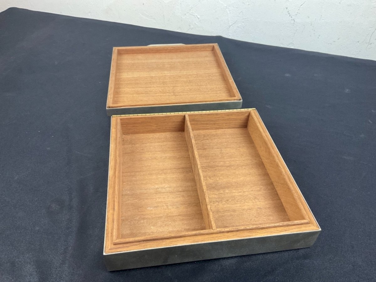 Silver-plated metal box by Jean Desprès, Gucci. Please note the hinge no longer holds. Dimensions: 18.5 x 18.5 cm Height: 4.5 cm Authenticity: Original Type: Showcase item, Decorative Brand: no brand Origin: France Period: Art Deco Subtype: box Material: silver metal