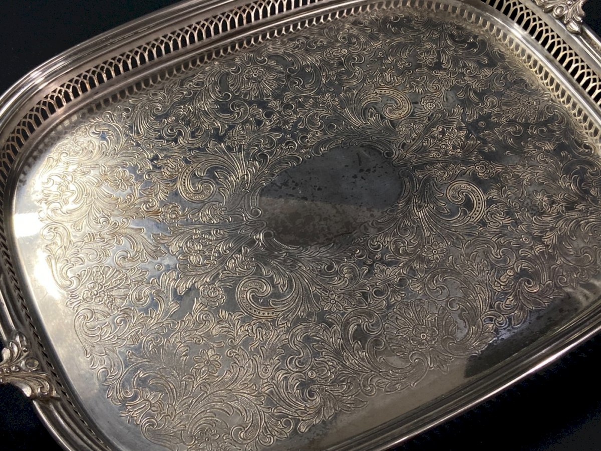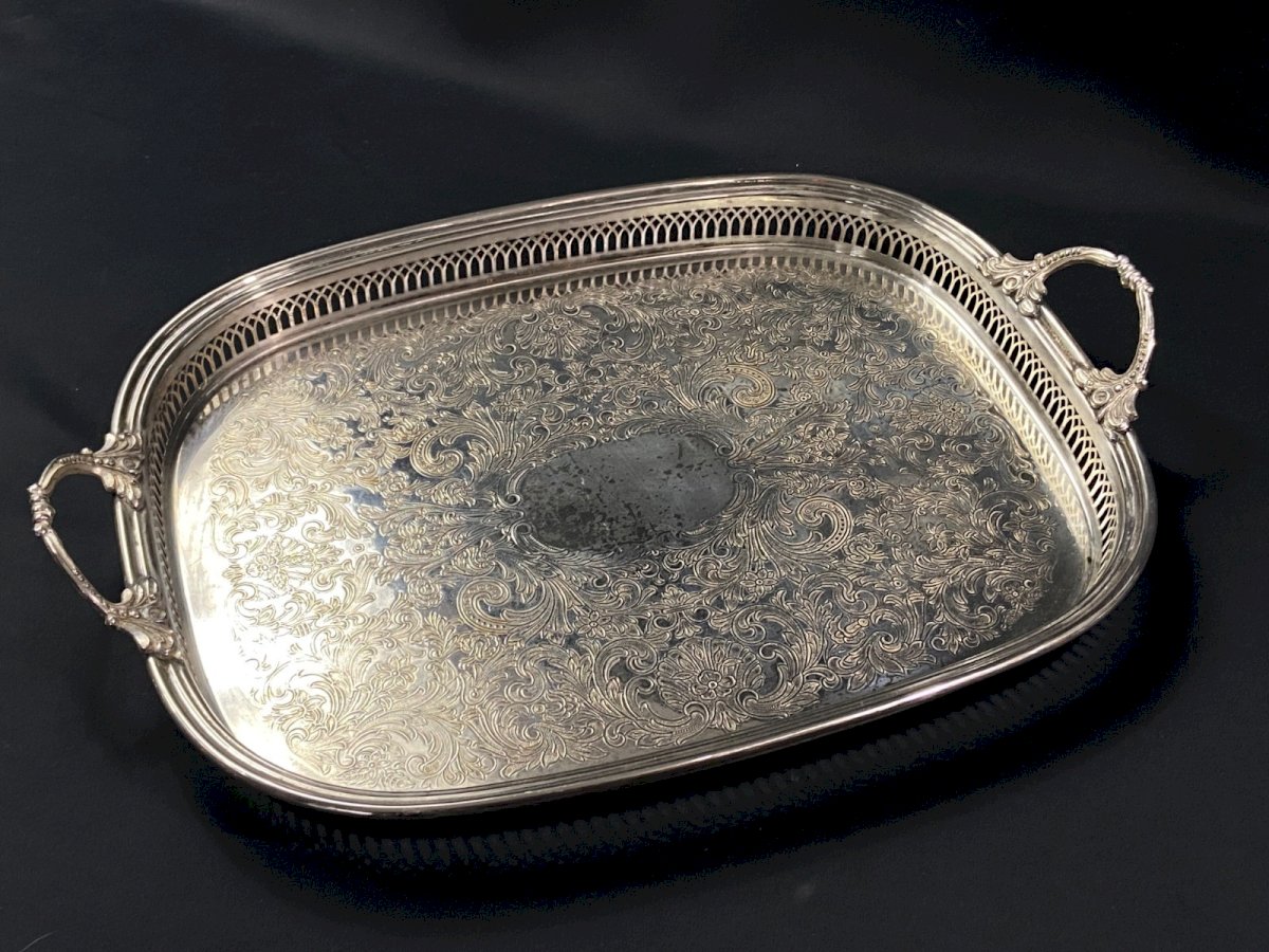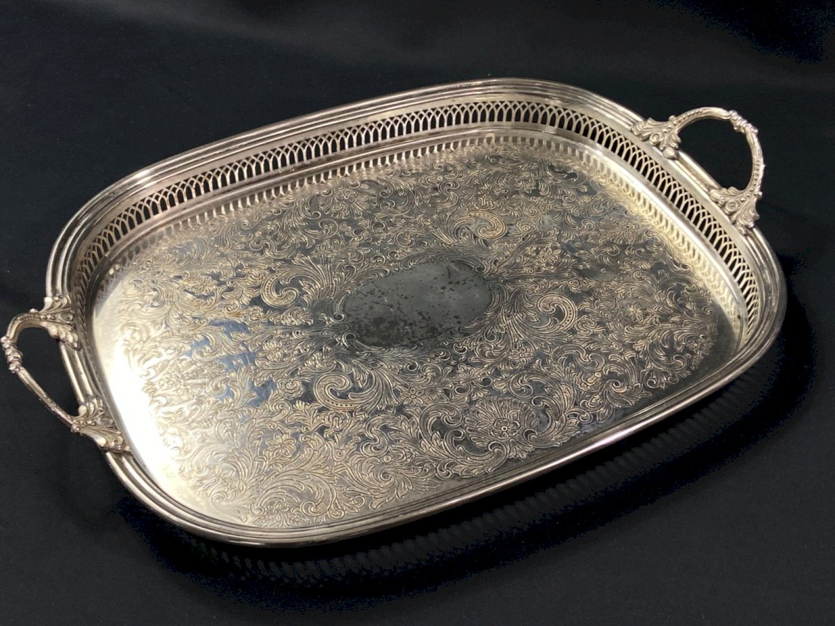 Silver-plated metal tray with handles in Regency style and pierced border Maximum dimensions: Overall width with handles 51 / width without handles 45.6 x 35.2 x Height 3.7 cm Weight: 1197 grams I point out the presence of traces of wear on the silver plating as well as usual scratches visible in the photos Very careful shipping worldwide Authenticity: Original Type: Tableware, Kitchen Origin: France Country of manufacture: France Subtype: Tray Material: Silver-plated metal