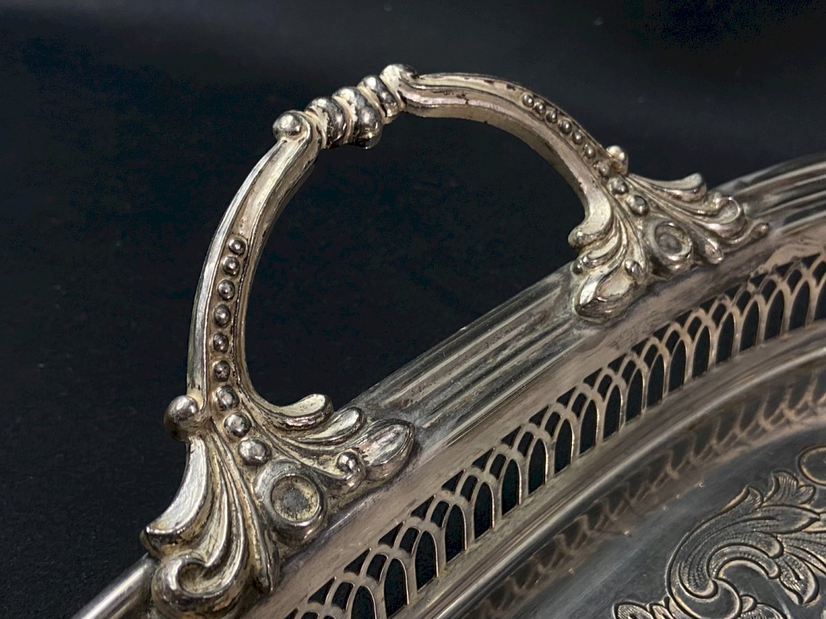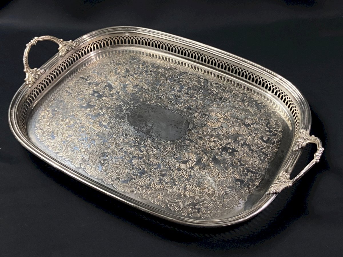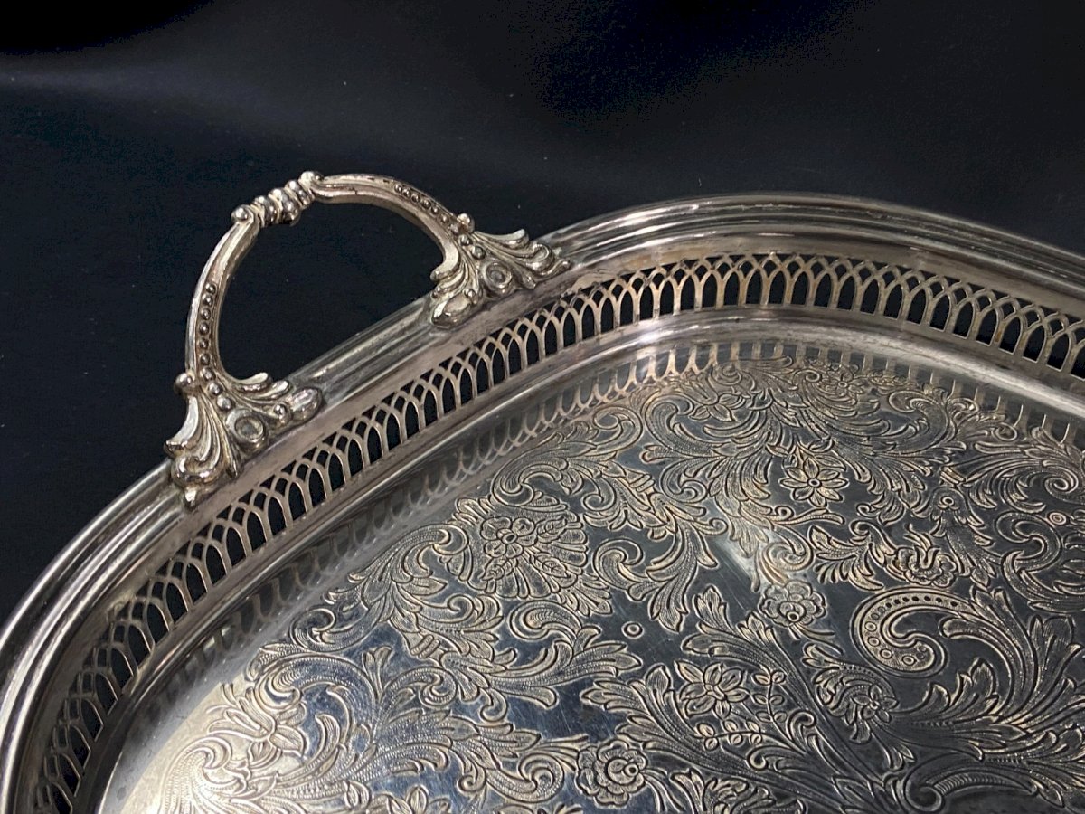 Silver-plated metal tray with handles in Regency style and pierced border Maximum dimensions: Overall width with handles 51 / width without handles 45.6 x 35.2 x Height 3.7 cm Weight: 1197 grams I point out the presence of traces of wear on the silver plating as well as usual scratches visible in the photos Very careful shipping worldwide Authenticity: Original Type: Tableware, Kitchen Origin: France Country of manufacture: France Subtype: Tray Material: Silver-plated metal
