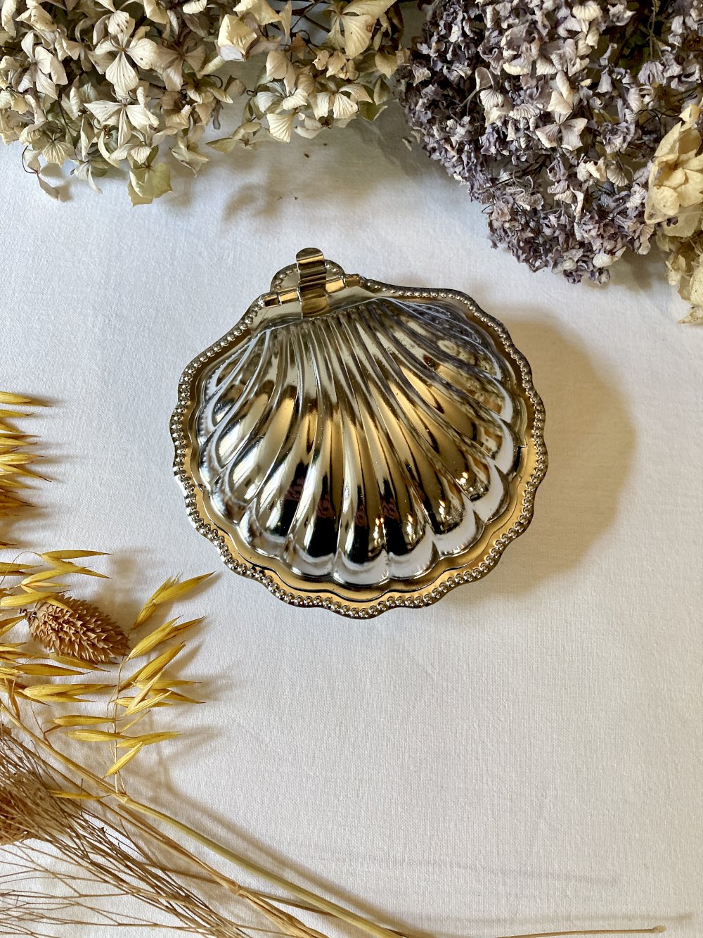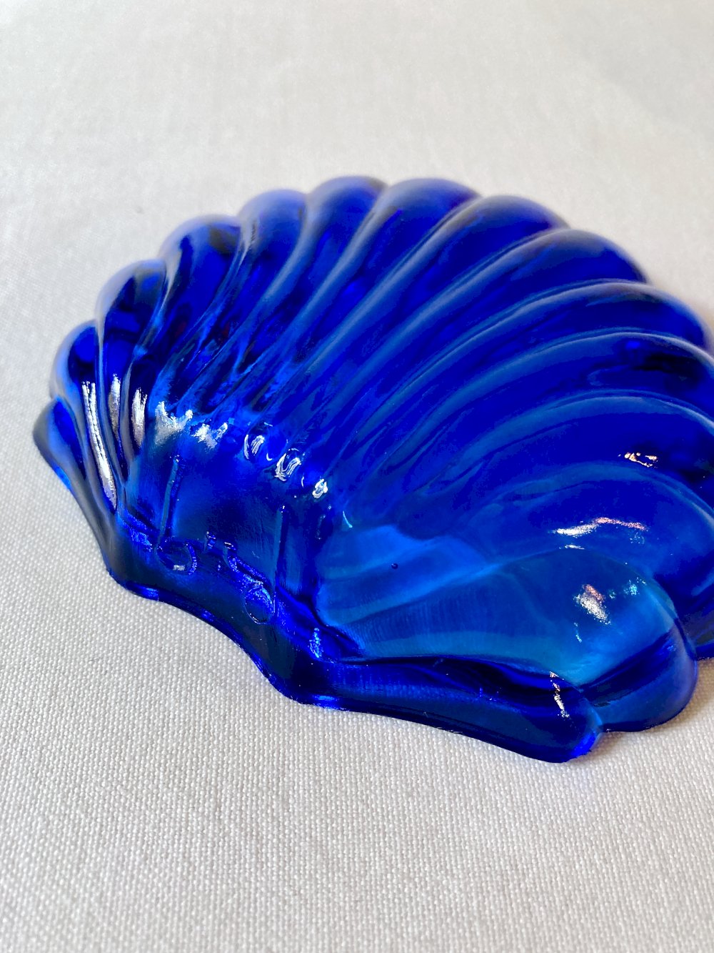 Elegant shell-shaped butter dish from the 1950s, complete with its cobalt blue glass dish.