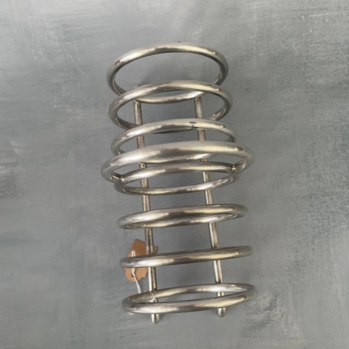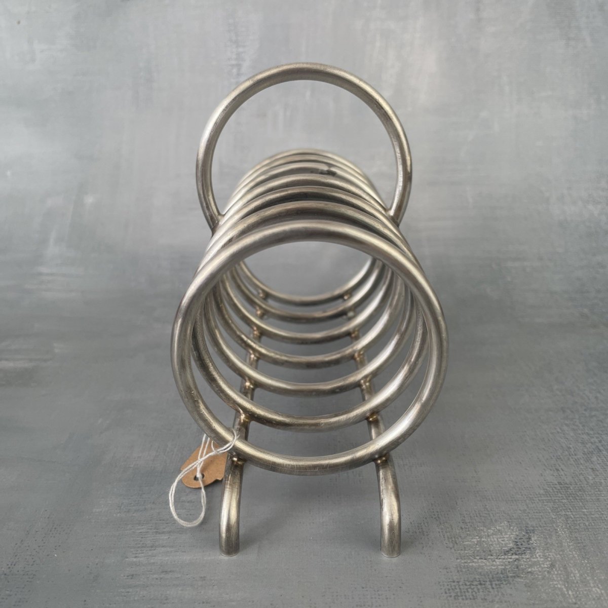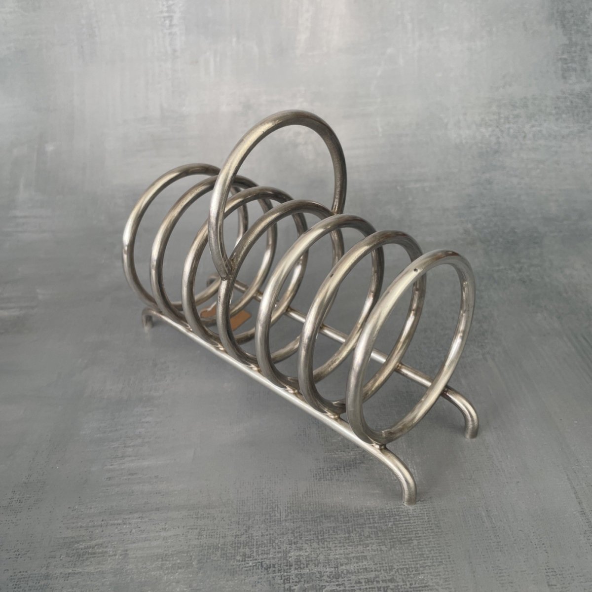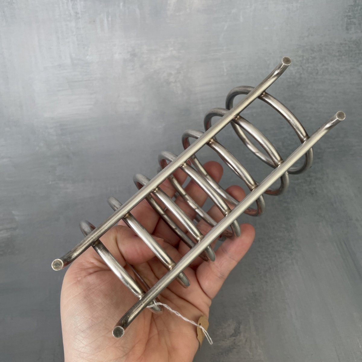 Silver-plated metal toast holder/display stand, hallmark-free Dimensions ~ 15.5 x 6.8 cm Height ~ 11 cm with handle Weight ~ 0.3 kg Excellent condition, no issues, see photos. Consider grouping your purchases to reduce shipping costs! Material: Silver-plated metal