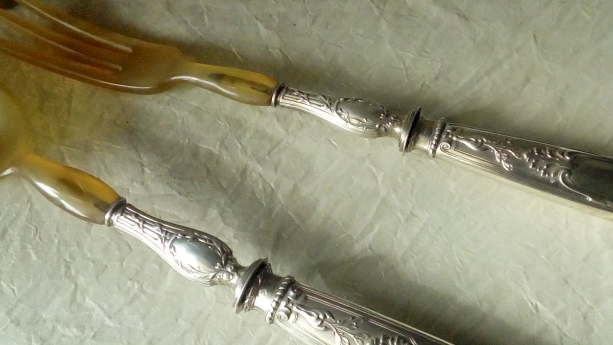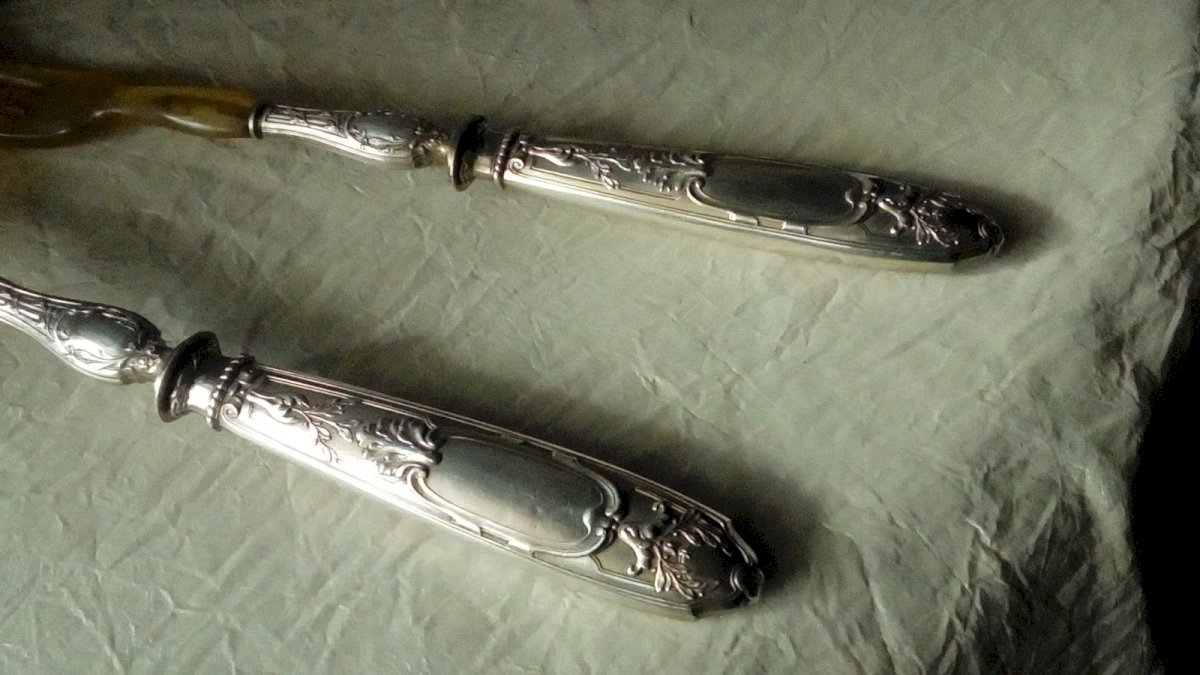 VERY BEAUTIFUL METAL SILVER PLATED SALAD CUTLERY AND HORN IN LOUIS XVI STYLE LATE 19th CENTURY LENGTH OF THE CUTLERY 28 cm IN GOOD CONDITION SIGNS OF USE ON THE BOX Authenticity: Original Type: Tableware, Kitchen Subtype: Cutlery Material: Silver Plate Style: Louis XVI