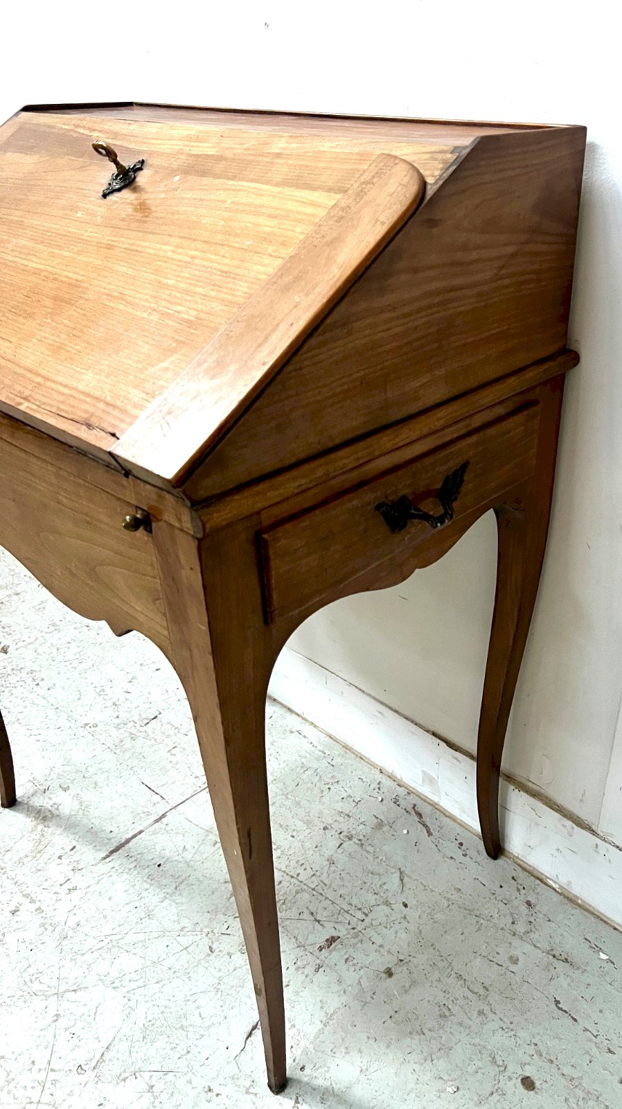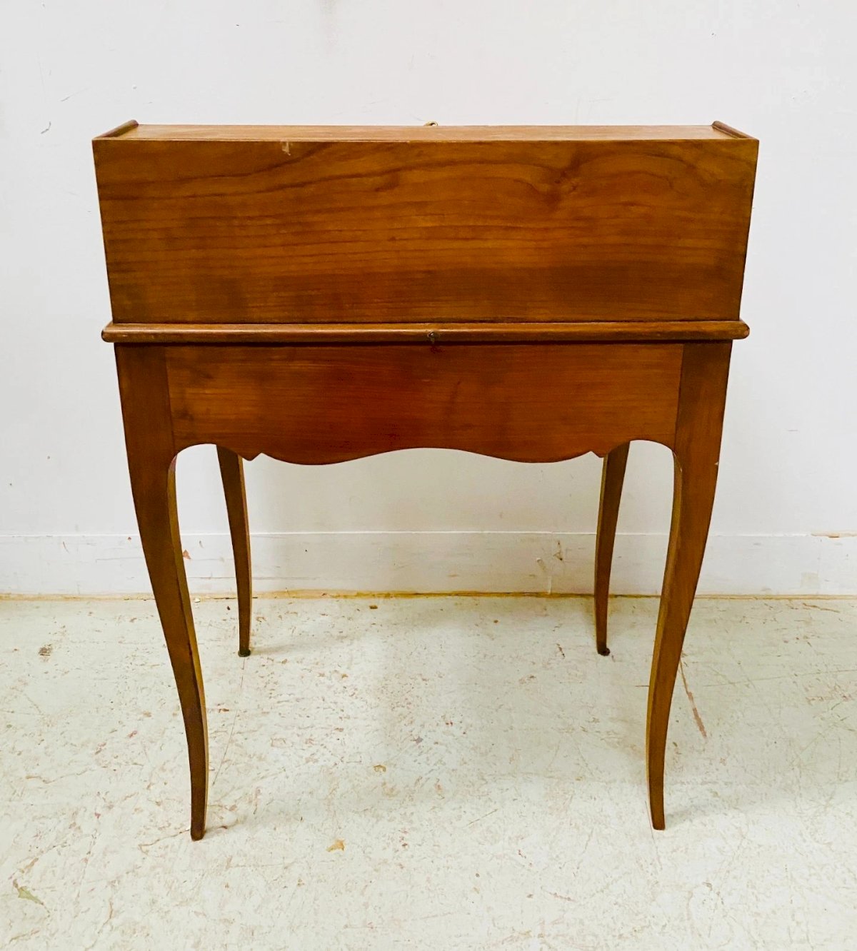 Cherry wood girl’s desk Four cabriole legs A drop front resting on two pull-outs The interior is compartmentalized with a drawer and storage niches Good condition Dimensions H 87 x L 63 x D 44 cm 20th century Type: Simple desk Subtype: With drawer Height: 87 Material: Cherry Style: Louis XV, Neoclassical Length: 63 Width: 44