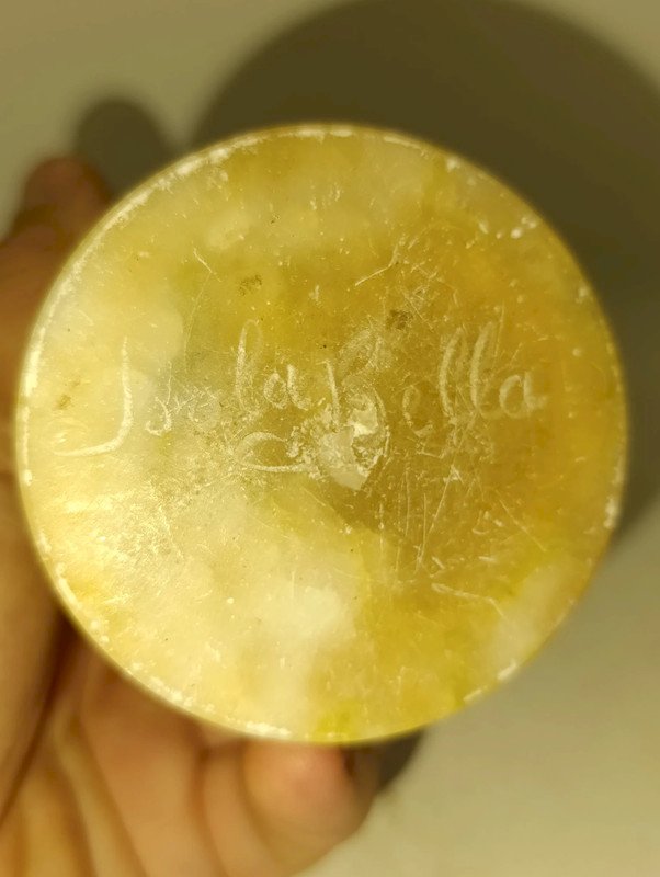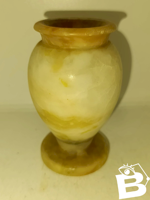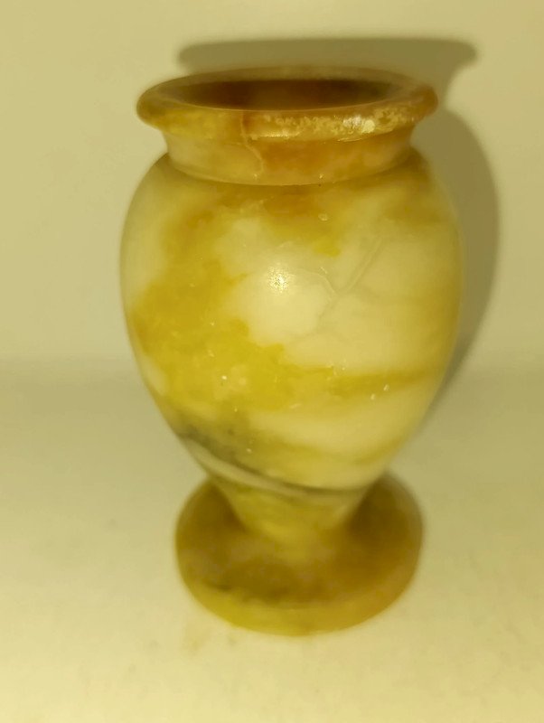 small alabaster vase signed underneath the base in good condition with a chip under the neck at the top (see photos) height 12cm...