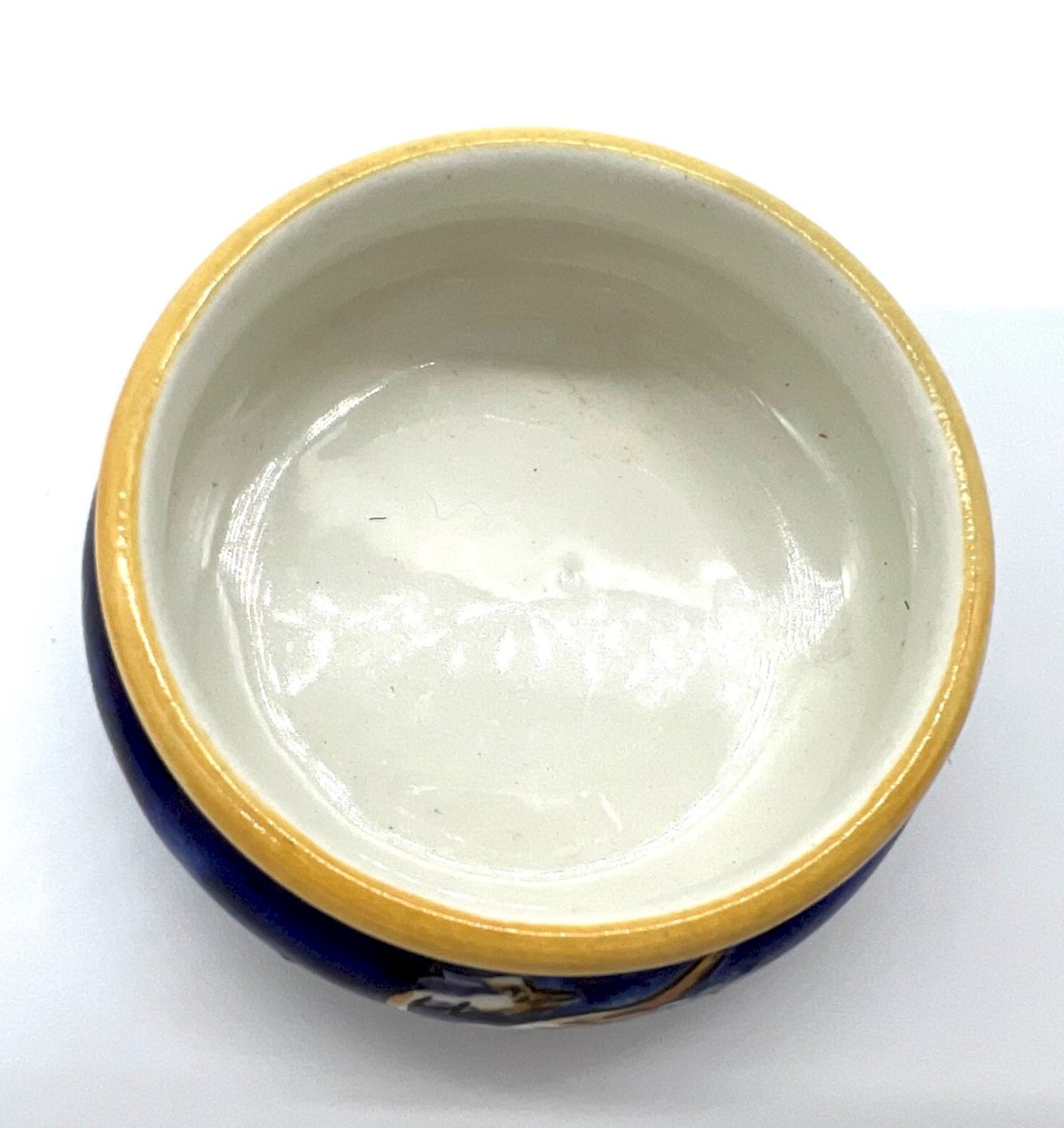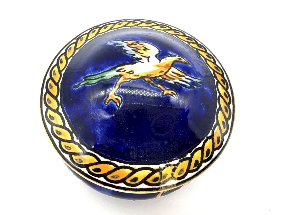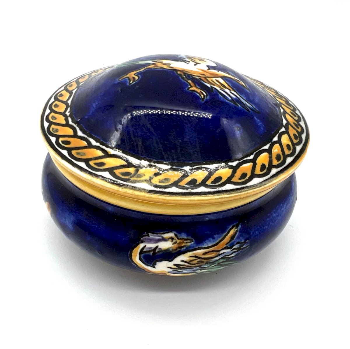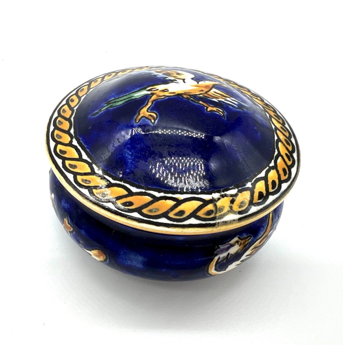 Charming small round box from the Gien factory (France), part of the famous Renaissance series, hand-decorated. The lid features a flying bird set against a deep cobalt blue background, surrounded by a frieze of intertwined yellow and black chains. The sides also display stylized patterns characteristic of the Renaissance decor. A beautiful item, ideal as a jewelry box, pillbox, catch-all, or as a refined decorative piece. Manufacturer: Gien, France Decor: Renaissance, hand-painted Dimensions: Diameter: 6.5 cm (≈ 2.55 inches) Height: 4.5 cm (≈ 1.77 inches) Condition: Very good overall condition, vibrant colors. Slight signs of wear visible on the lid (see photos). An elegant and decorative piece, perfect for completing a collection of Gien Renaissance pottery.