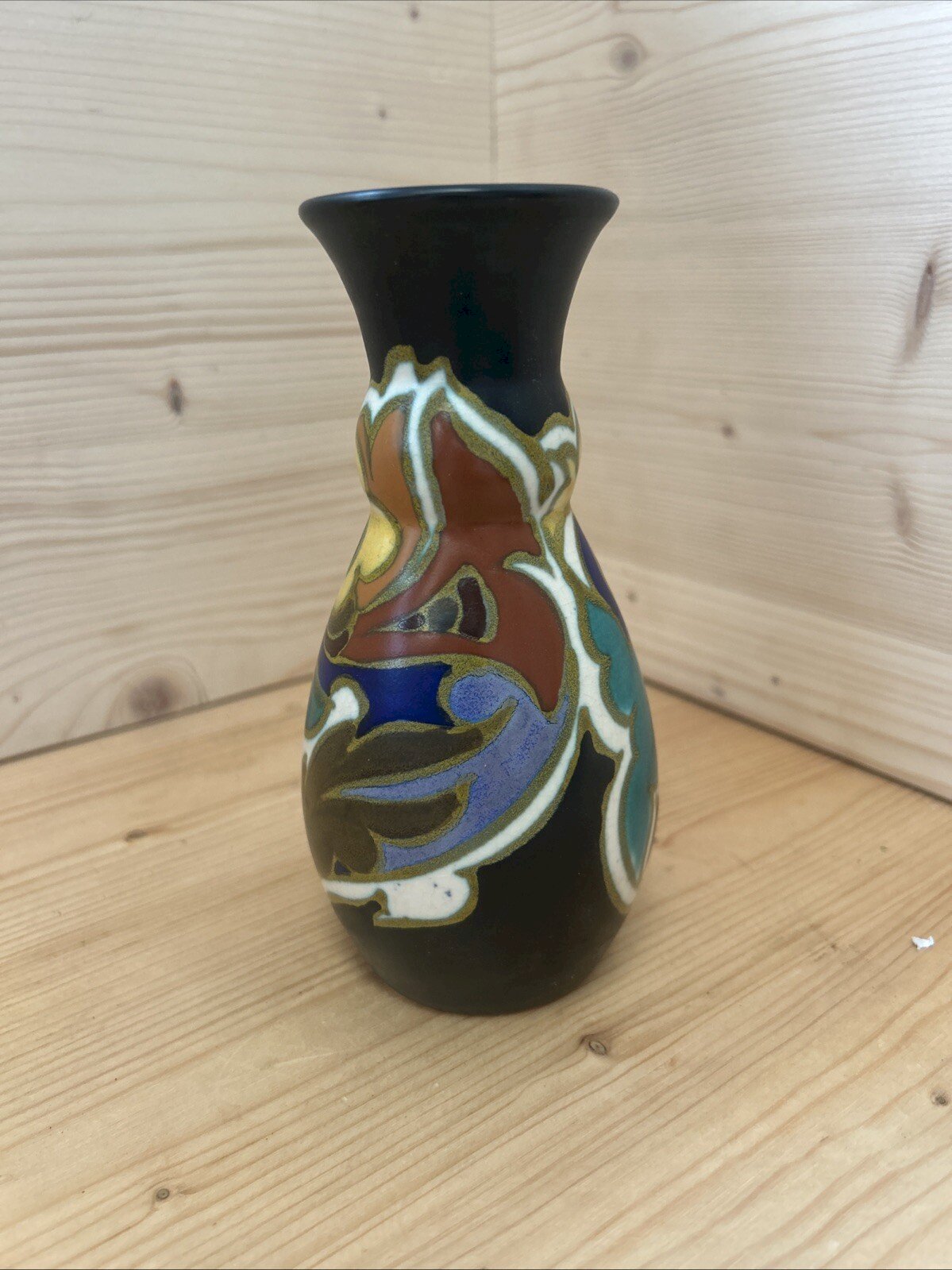 Small Gouda Holland vase – decorative model signed. Very beautiful miniature vase in Gouda earthenware, manufactured by the famous PZH (Plateelbakkerij Zuid-Holland). The stylized floral design, in bright colors (green, yellow, blue, orange), contrasts with the matte black background. This is a hand-painted model, numbered 2707, with the inscription "Plazuid Gouda Holland" under the base. Origin: Gouda, Holland Manufacturer: PZH Plazuid (Plateelbakkerij Zuid-Holland) Model: 2707 Decoration: polychrome glazed with abstract floral pattern, black background Material: glazed earthenware Dimensions: approximate height 16cm Condition: excellent, intact glaze, no cracks or chips Signature: handwritten under the base (with model number and origin mark) A Dutch piece full of character, ideal for lovers of 20th-century decorative ceramics. Country of origin: France