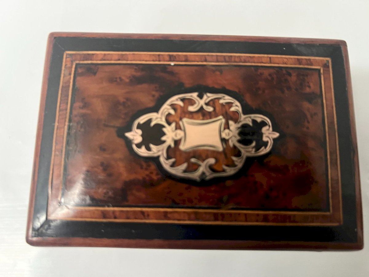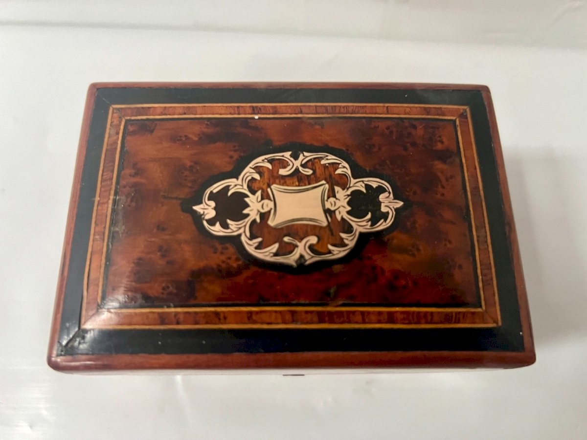 Small Jewelry Box made of thuya burl plywood Beautiful brass marquetry engraved on a pink wood background Inlay of light wood fillet Functional key and lock Dimensions H 8 x L12 x 8 cm 19th century Type: Showcase object, Decorative Origin: France Subtype: Box Country of origin: France Height: 8 Material: Wood Style: Napoleon III Length: 12 Width: 8