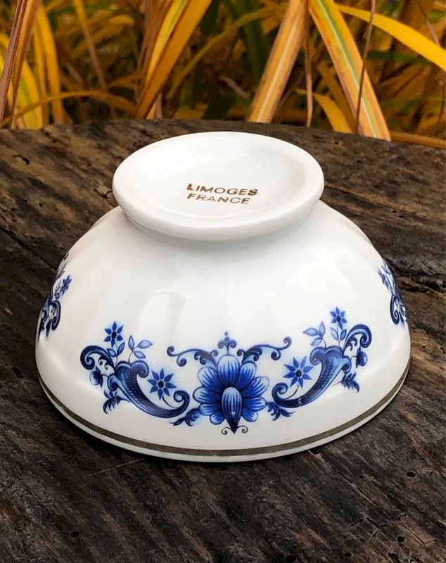 Small Limoges porcelain bowls with blue flower designs. White/Blue