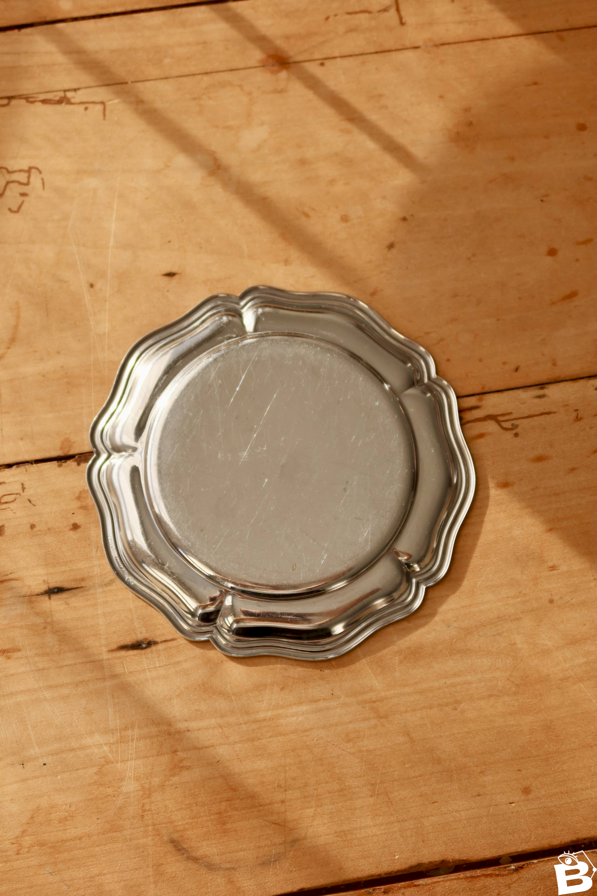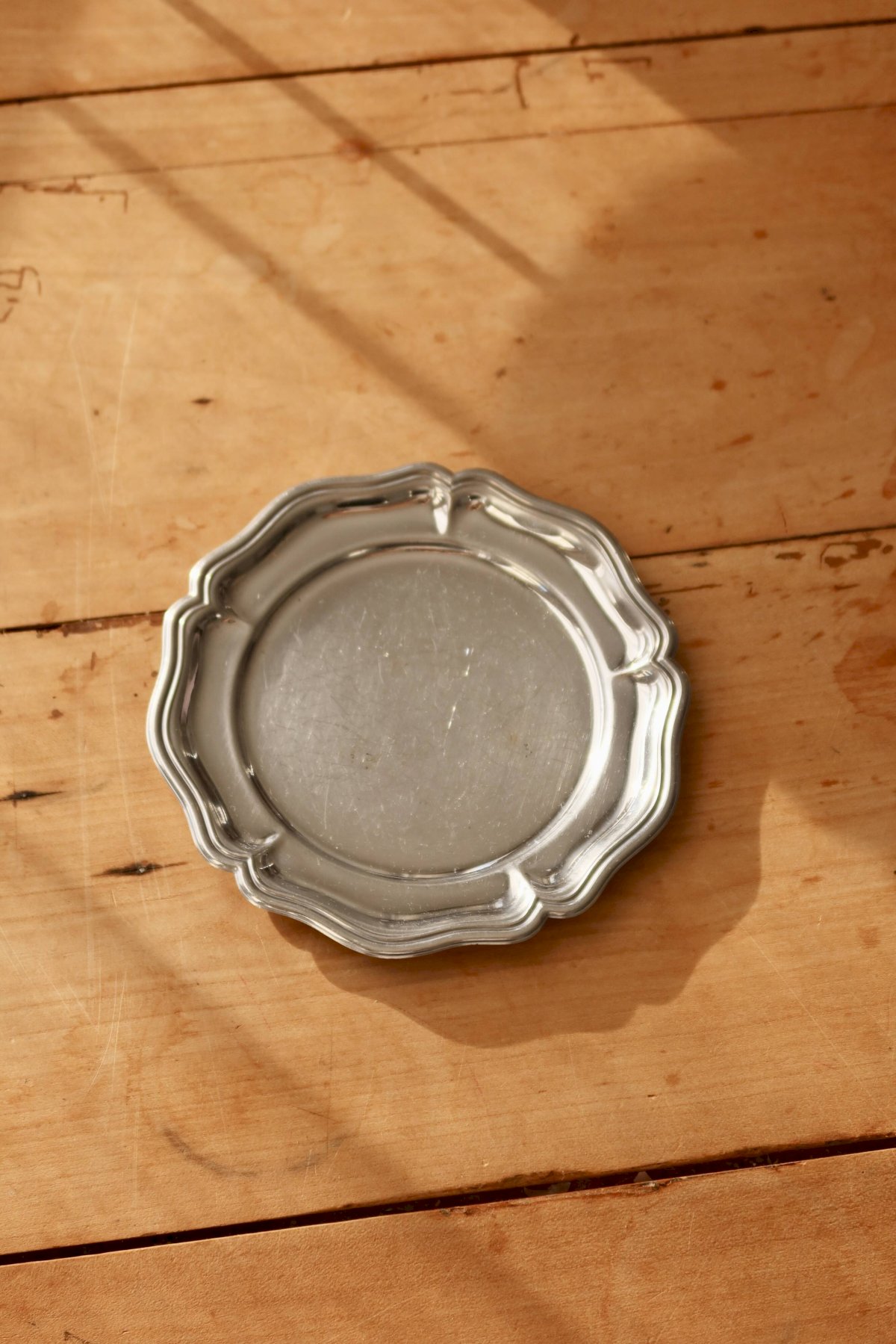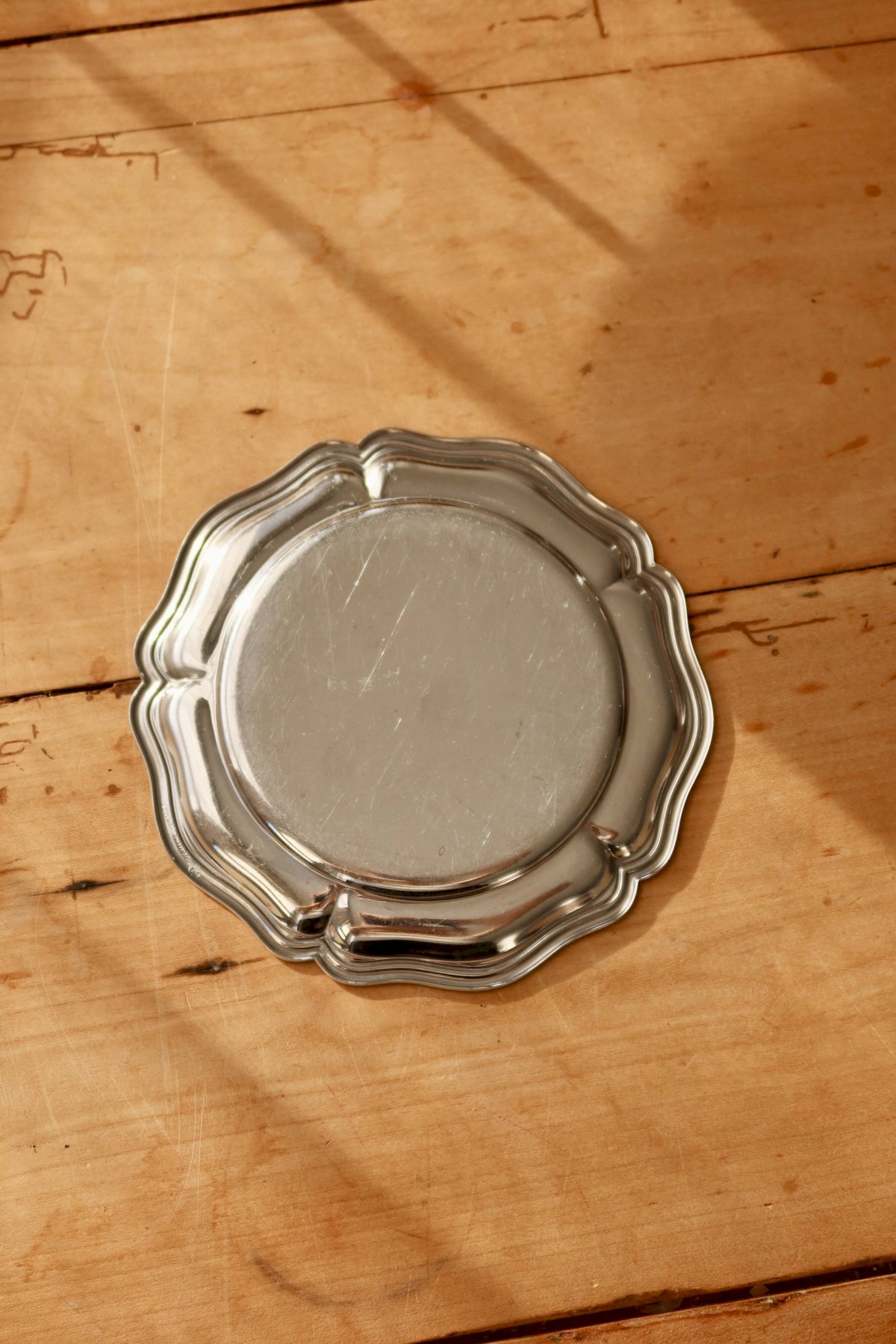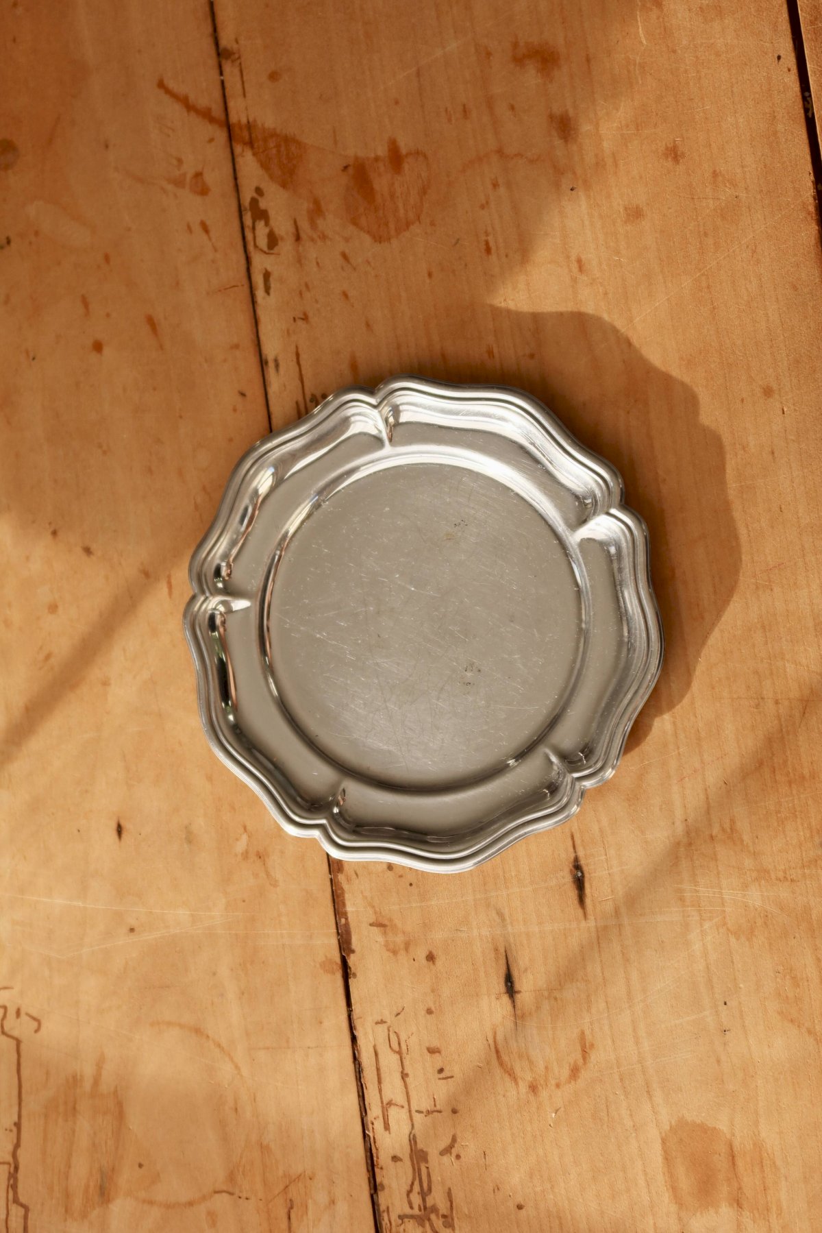 Pretty little vintage round dish with a slightly scalloped edge, featuring a sober and timeless aesthetic. The surface shows micro-scratches and signs of use consistent with its age, without deformation or chipping. Ideal as a catch-all, serving dish, or decorative element. Diameter: 13.5 cm. Net unpacked weight: 95 g. L: 13 W: 13 H: 1